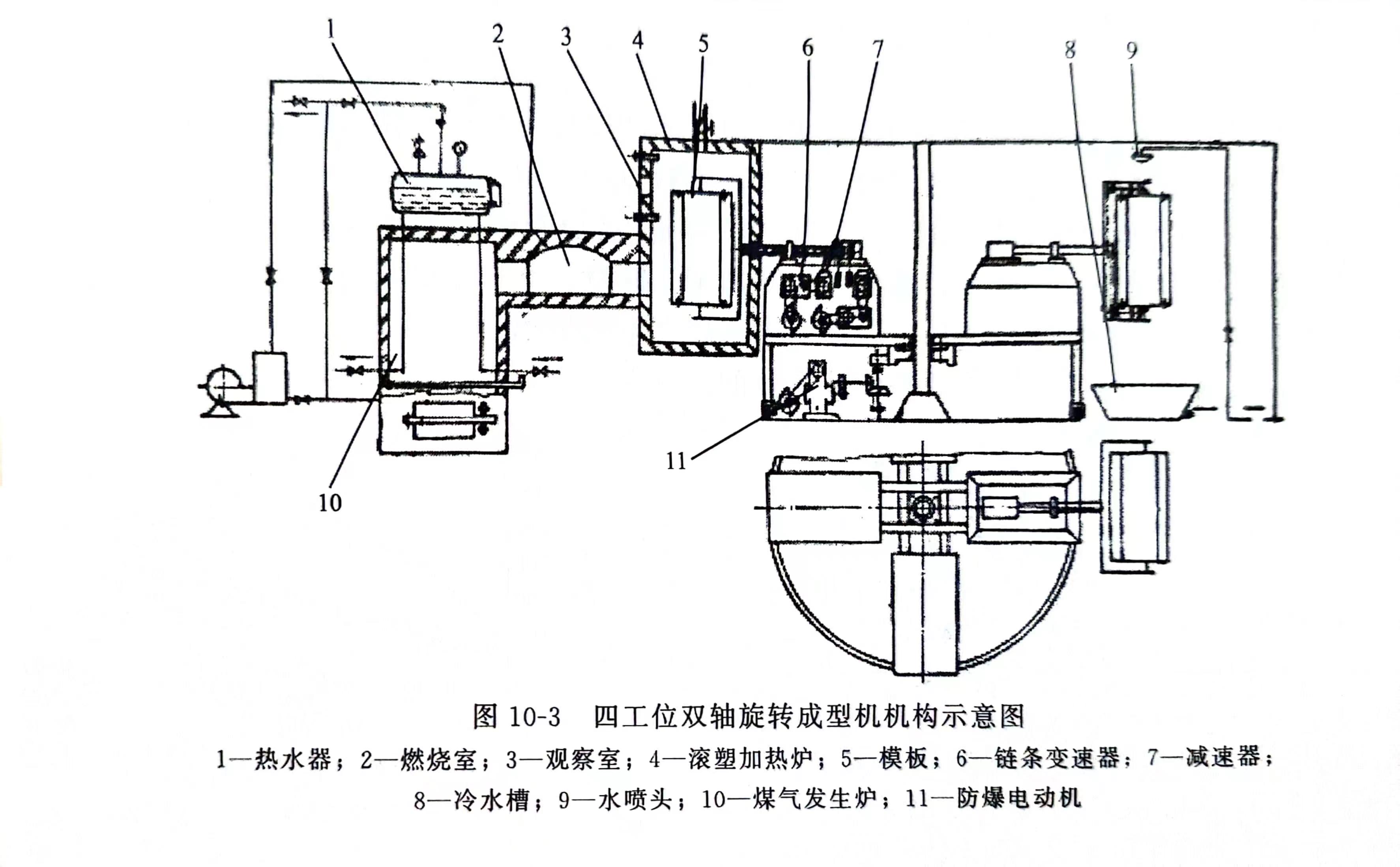 摇动旋转成型机主要适合大型制品的生产。一般取单模结构,其典型结构形式工、Ⅱ如图10-4与图10-5所示。这种大型制品的成型,如果加热装置和冷却装置之间来回移动是比较困难的。所以一般多采用在一个台架完成加热与冷却过程。加热多采用煤气火焰加热方式,冷却多采用空气和喷水并用的方法。回转轴承担使模具横向旋转,曲轴承担摇动动作,产品越大其旋转速度和摇动频率越慢。其速度之比仍根据产品大小和形状来决定。模具固定在带沟槽的环形轨道上。为使模具受热均匀,尽量固定在环形轨道的中心部位上。