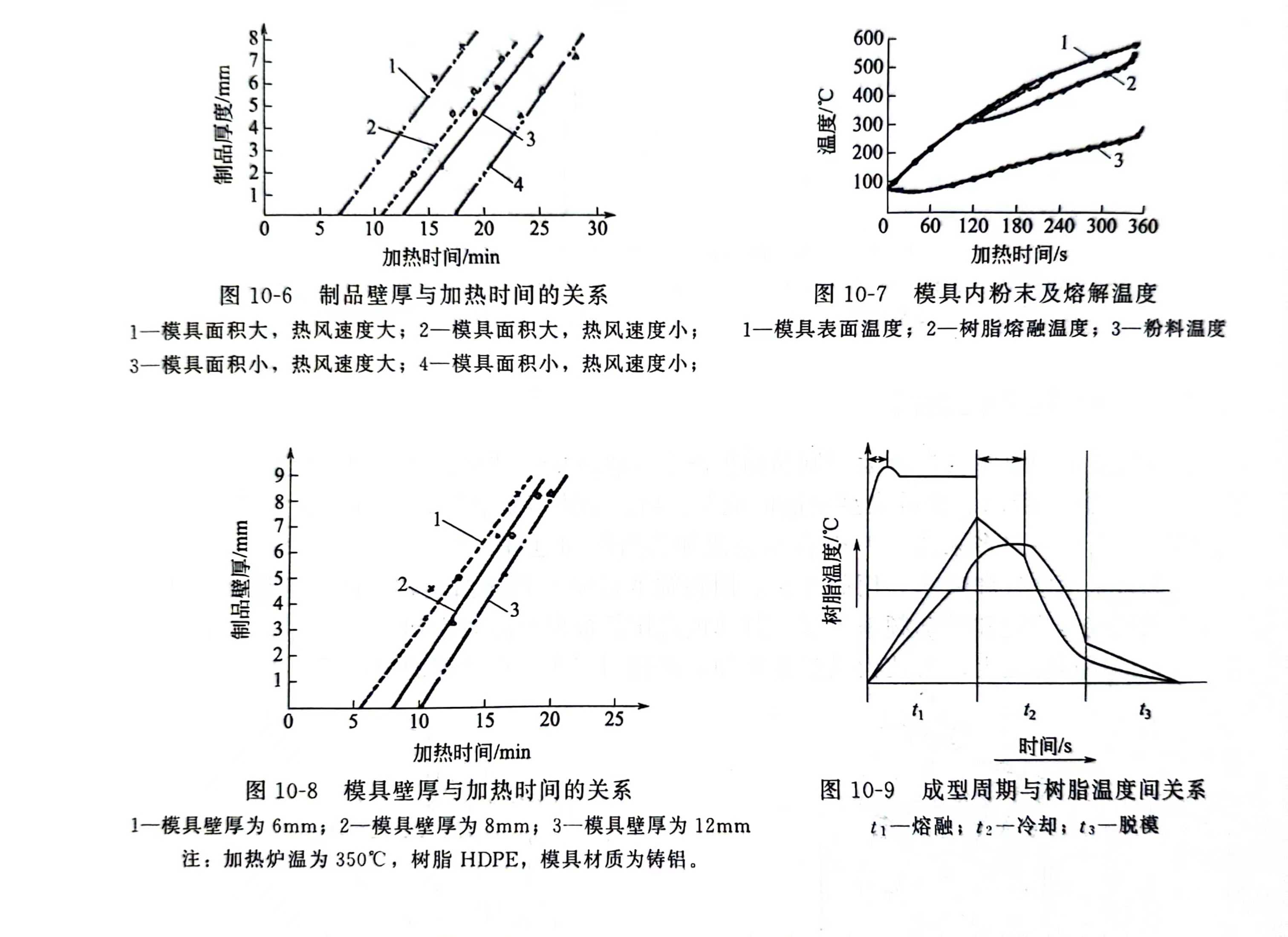 图10-6~图10-9中清楚地说明,在同样壁厚的制品成型时,加热温度越高,则加热时间越短,模具表面积越大、越薄,则加热时间越短。同时,在一定时间内其模具温度与熔体温度以及粉末温度都有明显的差异,但是转速越高,差异越小。