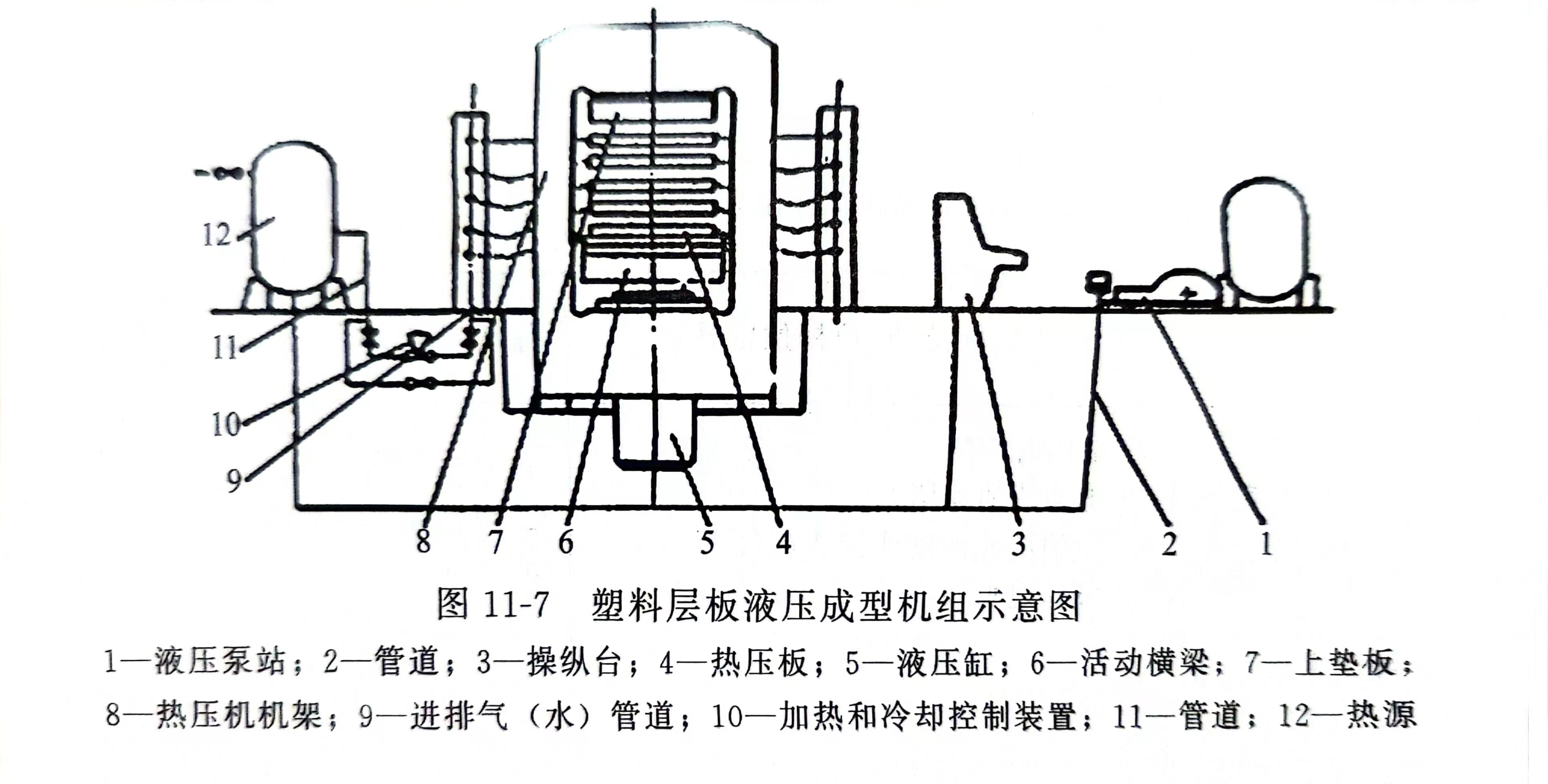 层压机(图11-7)主要结构特点是既具有多层热压板,用来均匀的传递液压缸的压力,同时又是热量的传送装置。因此要求热压板有足够的热容量,工作面板温度要均匀,有一定的强度和刚度。工作表面的平面度与粗糙度,这些因素都将直接影响产品的质量。热压板一般由厚钢板制造,为适应不同加热介质,板内加工成各种不同结构形式的流道。