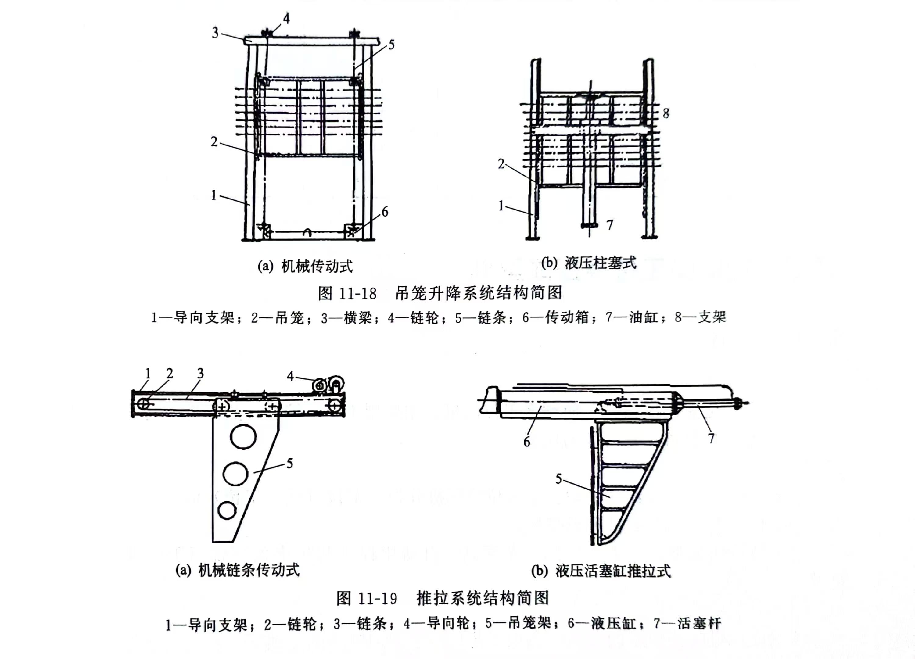 为减少辅助工时,提高劳动生产率,减轻劳动强度,层压机大都配备板坯及成品的装卸设备。装卸机由支架、吊笼升降系统及推拉系统组成。支架既是推拉装置的支撑,又是吊笼升降系统的导向轨道。吊笼升降系统(图11-18)中的吊笼是板坯送入压机前或成品拉出后过渡存放用的活动支架。升降系统是为适应各层热压板的高度将板坯推入和成品拉出,并依次连续地进行。吊笼升降系统有机械传动式和液压柱塞式,后者较常用。