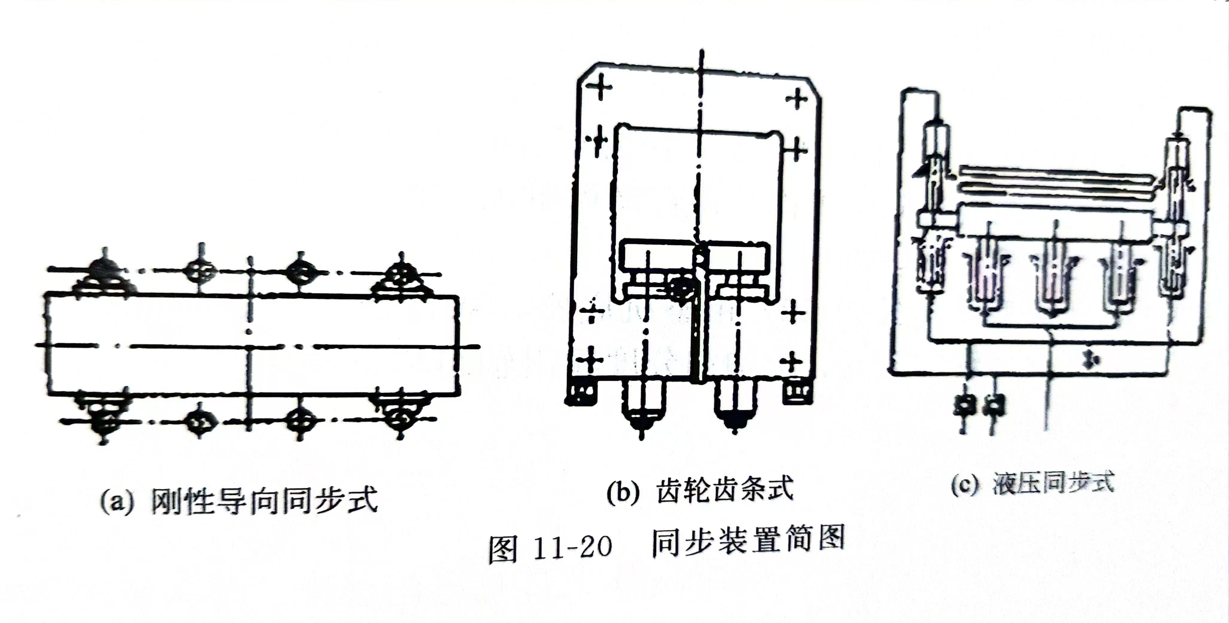 层压机大都为多缸结构,各缸密封圈阻力不尽相同,故在升降过程中会产生不同步的情况,导致横梁倾斜,故层压机大都设置同步装置。常用的同步装置由刚性导向同步式,齿轮齿条式和液压同步式(图11-20)。