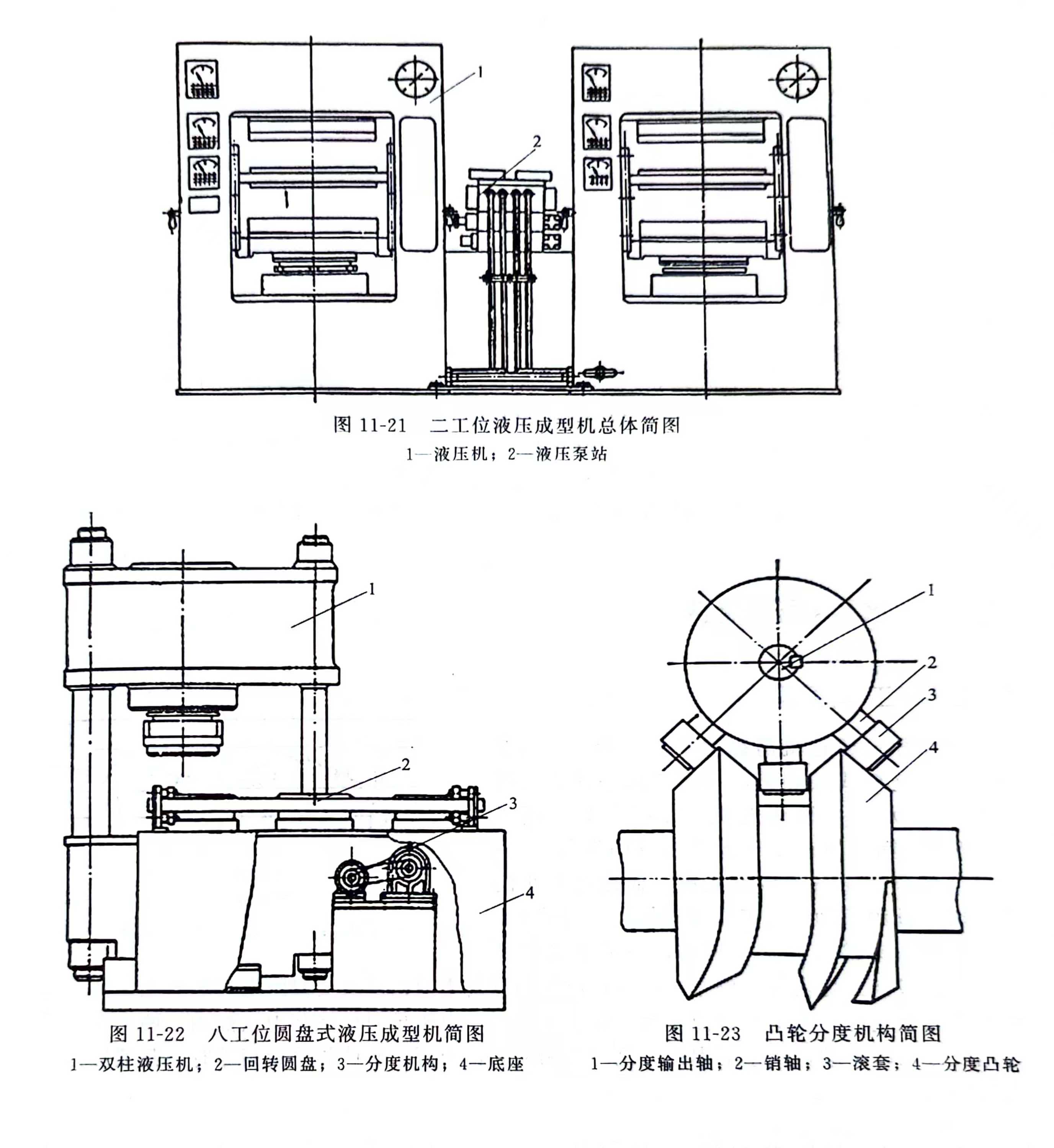 二工位液压成型机总体如图11-21所示。其特点是两台液压机,一个液压泵站,每台液压机的速度可单独调节,两台可同时工作,每台又可单独操作。