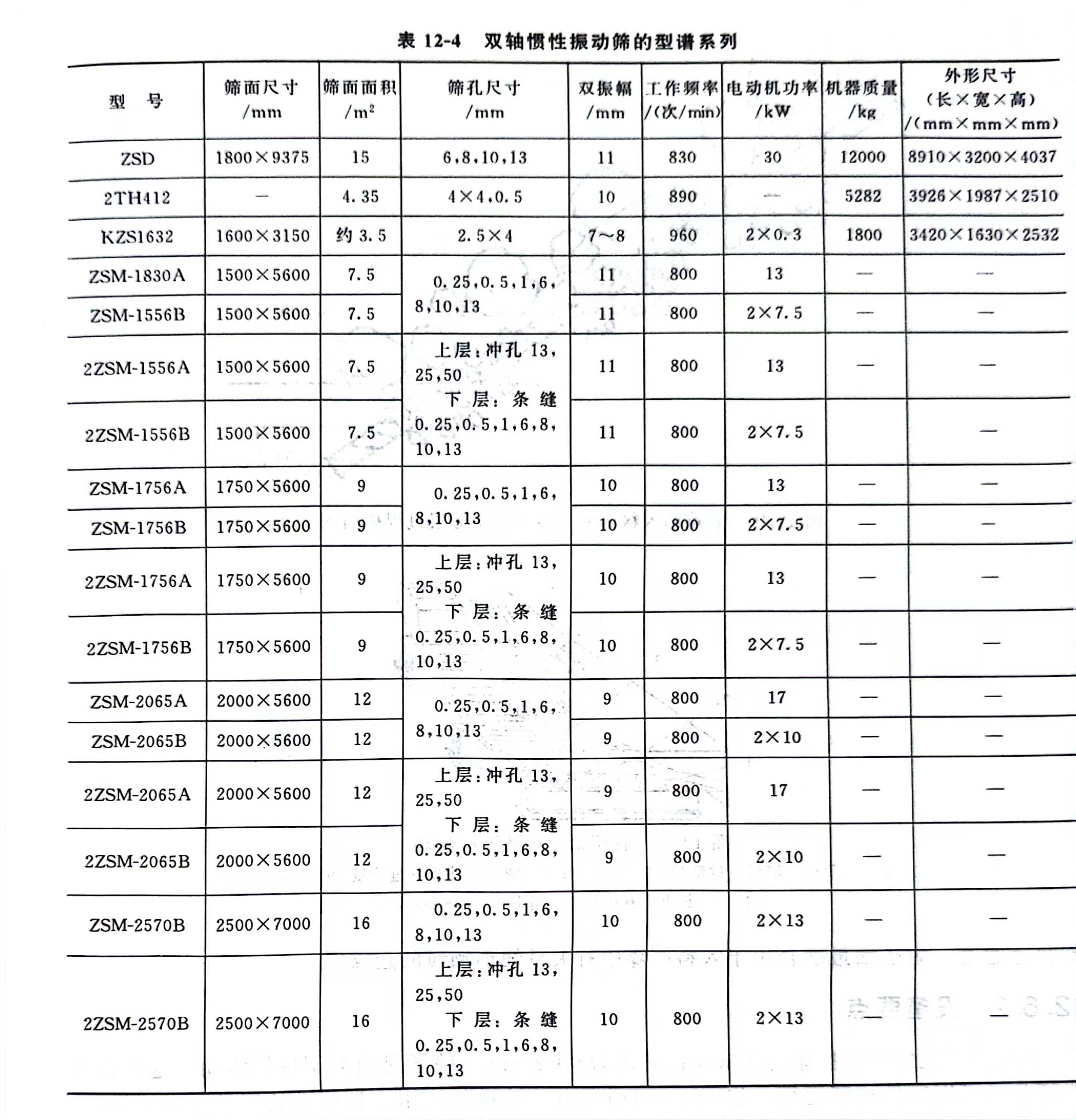 双轴惯性振动筛的型谱系列如表12-4所示。