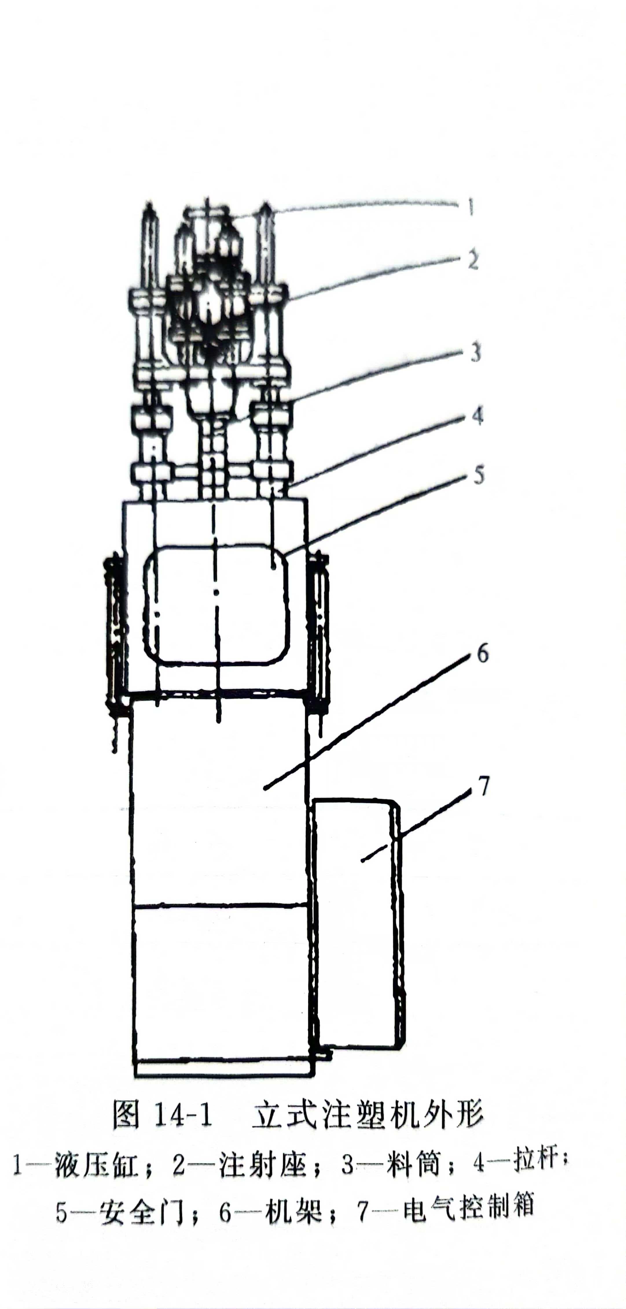 立式注塑机(图14-1)主要由注射部件、合模部件、机架等机械系统、液压系统、电气控制系统、加热冷却系统、检测系统等组成,其各部分功能与普通注塑机相同。