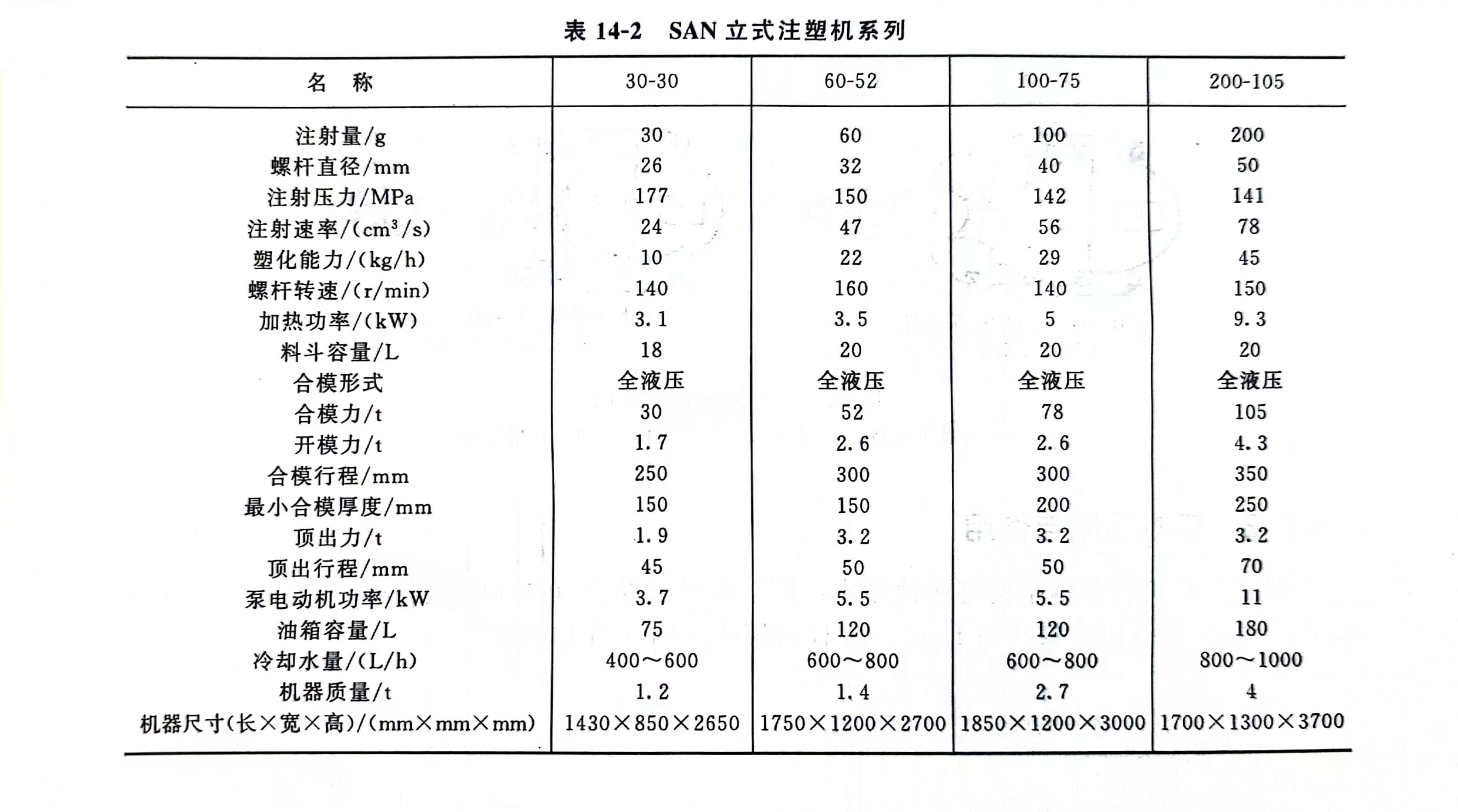 日本和德国都有立式注塑机的型谱系列,表14-2为日本SANJOSEIKI公司生产的立式注塑机系列。