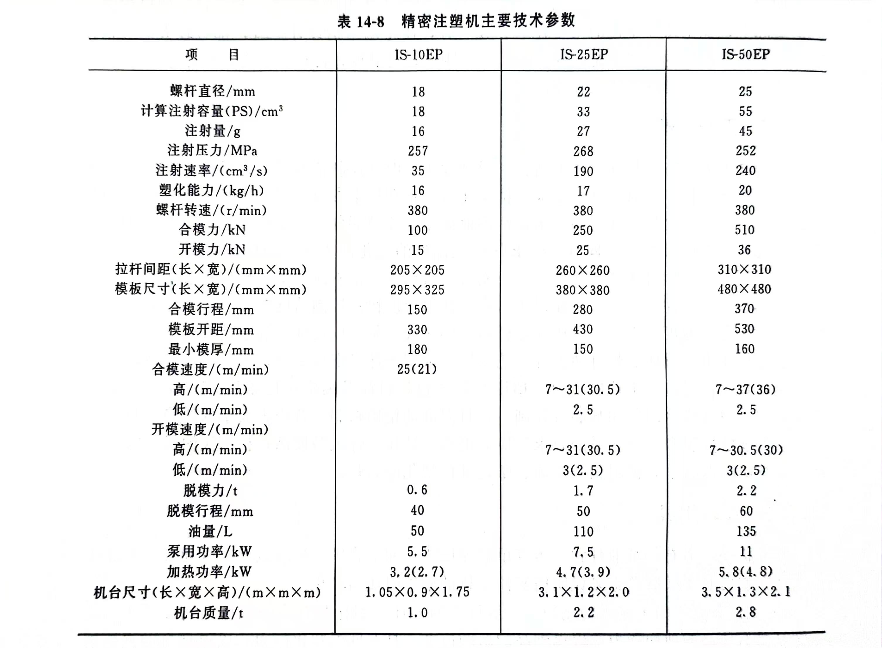 精密注塑机的技术参数与普通注塑机相比,在参数的意义上虽然相同,但是参数的数值上有较大差别,特别在注射压力与注射速率上偏高,如表14-8所示。