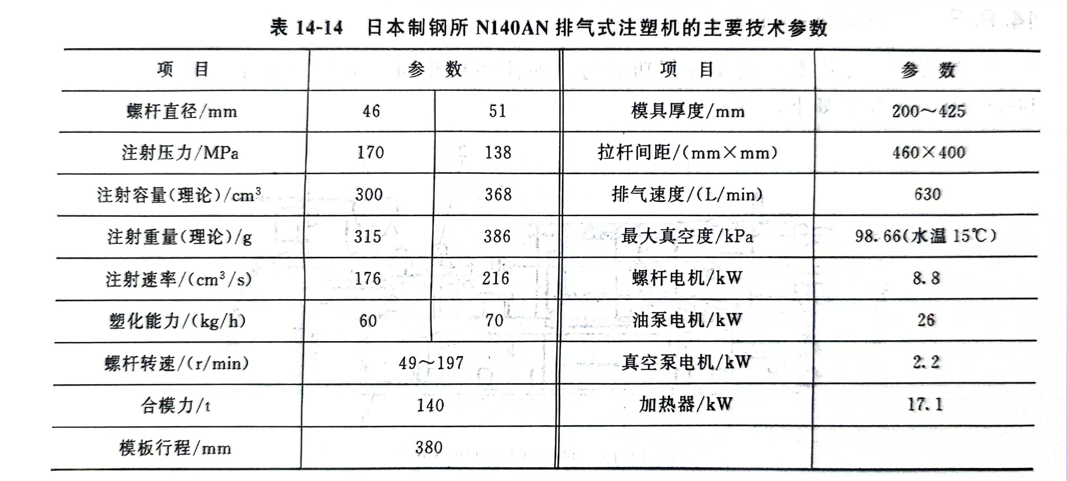 排气式注塑机的主要技术参数与普通注塑机基本相同,所不同的,只是螺杆部分的工作参数以及排气辅助装置部分的性能参数不同。表14-14是日本制钢所NI40AN排气式注塑机的主要技术参数。