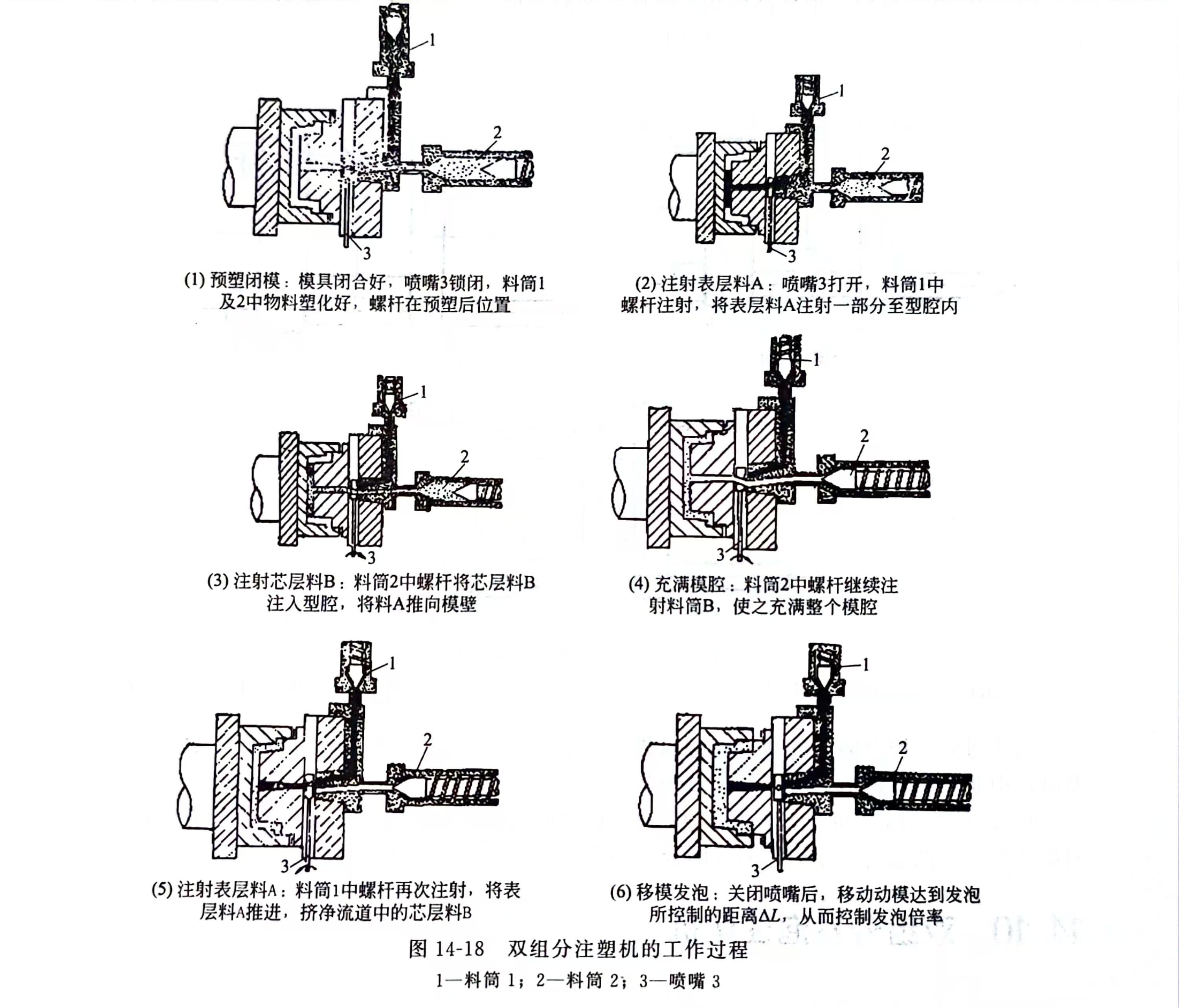 1)相继注射法 此法的特点是,按照工艺程序通过液压、电气控制装置操纵两个注射液压缸及转动分配喷喘将位于两个料筒中塑化好的两种物料,依次连续地将表层料及芯层料相继注入模腔。其工作过程如图14-18所示,而此法的缺点是注射速度慢,一般在2s内完成,而且两种料在交替注射时熔料会出现0.1s左右的瞬间停滞,而出现制品表面的缺陷。