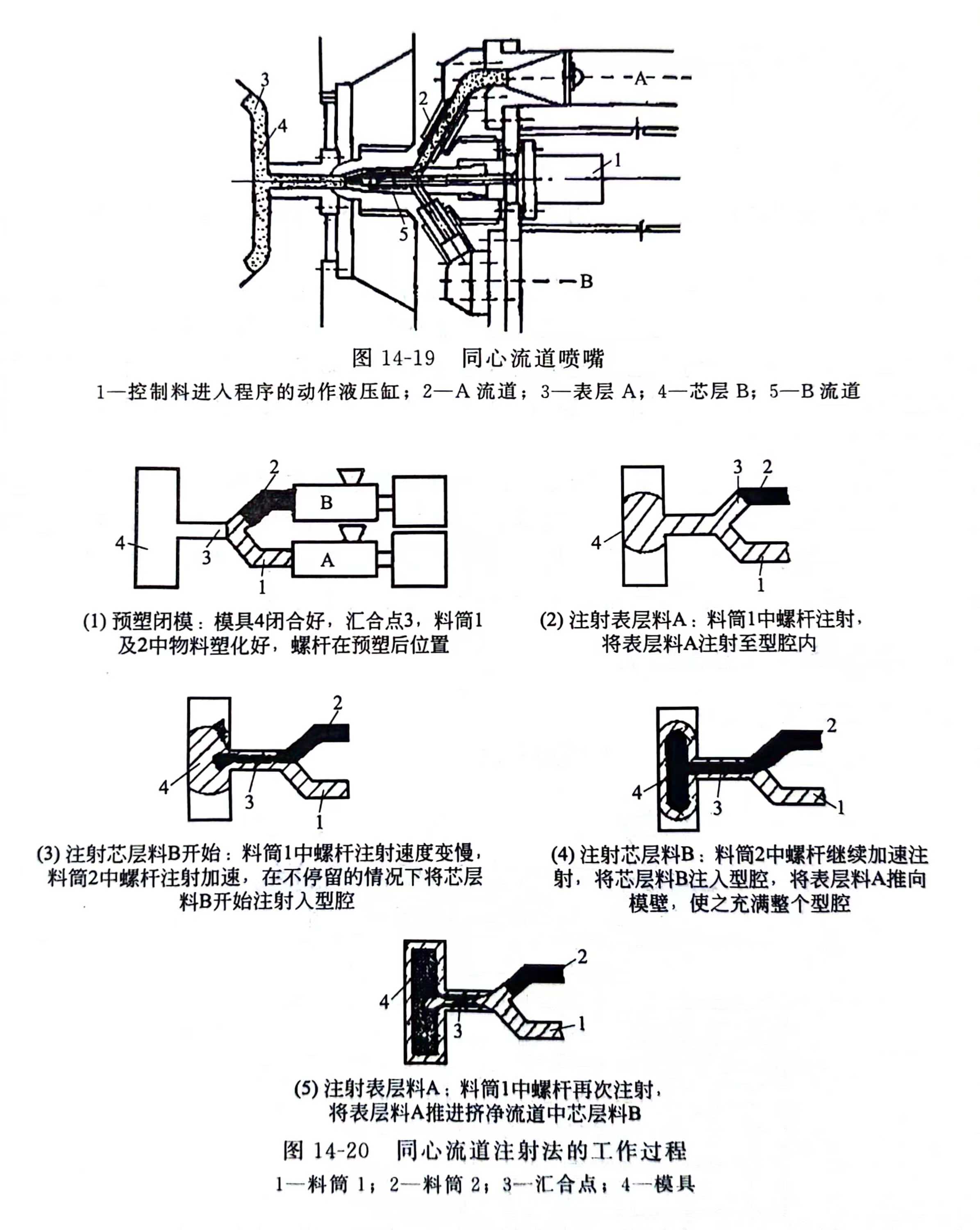 2)同心流道注射法 同心流道注射法主要特点是使用了同心流道的喷嘴(图14-19),使之在注射时,可连续地从第一种塑料转换成第二种塑料(若使用储能器高速注射油路,能保证0.5s内将表层和芯层材料注人模腔)。当注射螺杆1接近注完表层料A而慢慢降速时,注射螺杆2就开始加速注射,两种料在交替注射时没有停留,防止了制品表面的痕迹。其工作过程如图14-20所示。