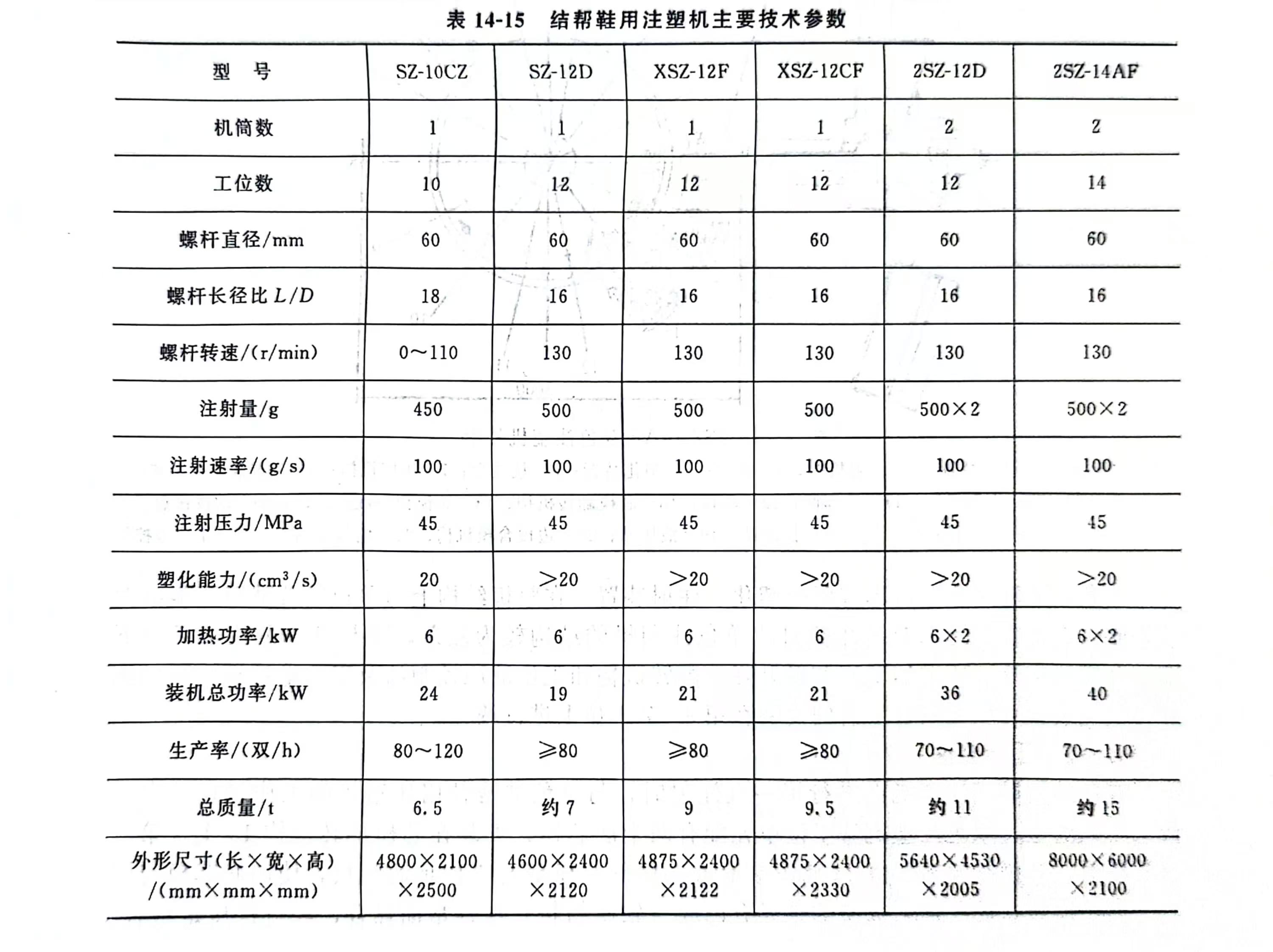 结帮鞋用注塑机主要技术参数如表14-15所示。