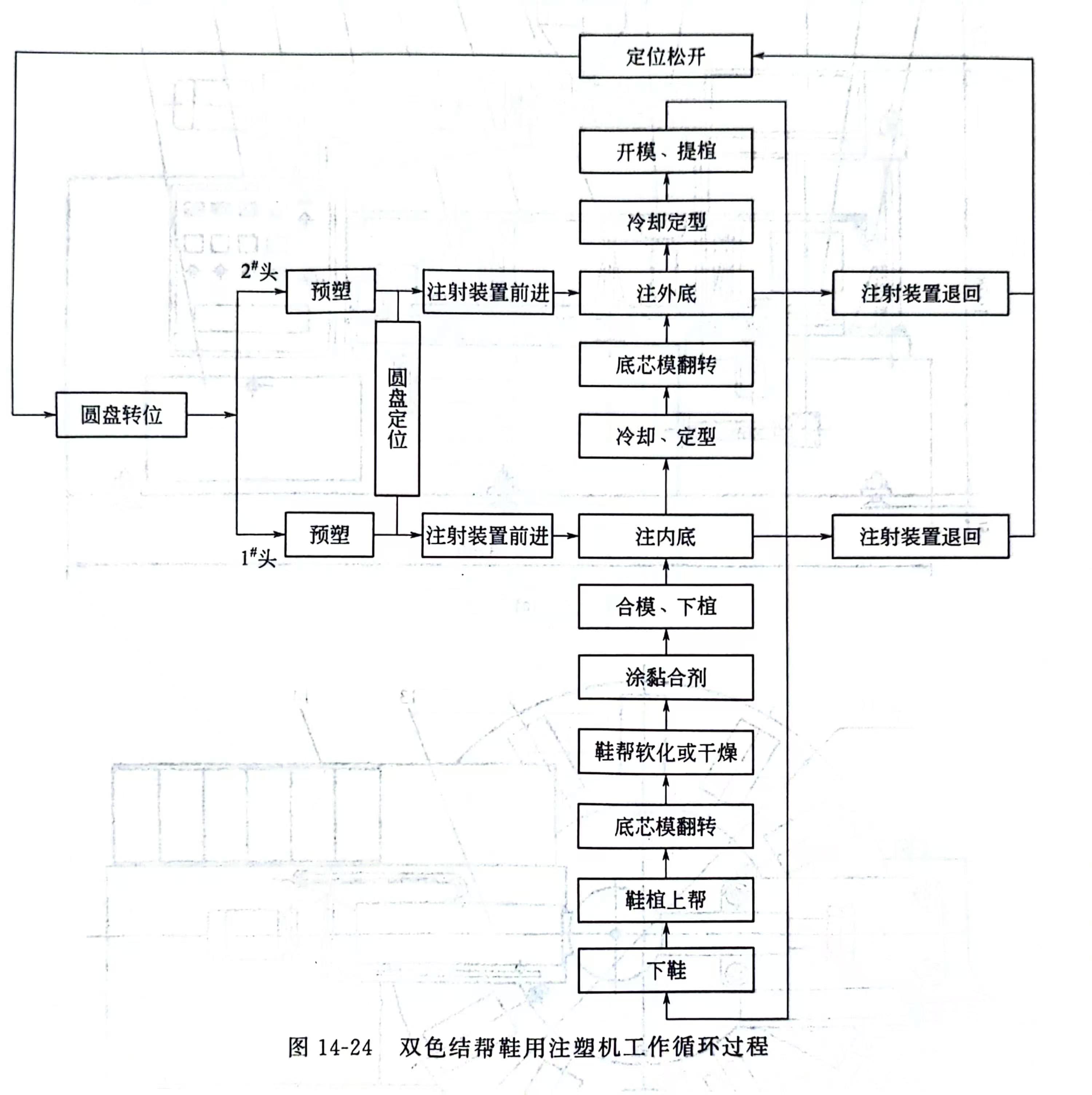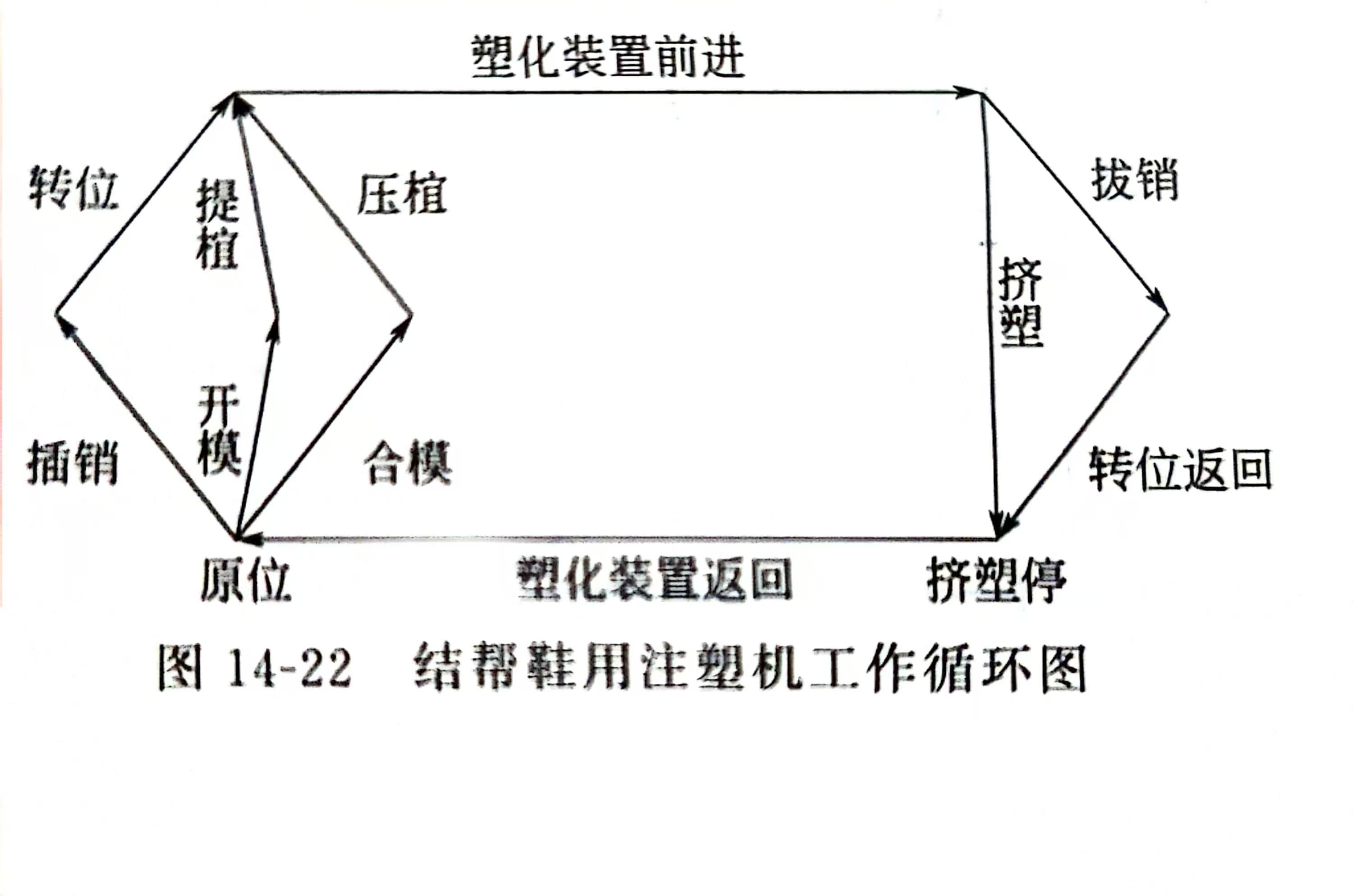 双色结构鞋用注塑机在进行第一次注射时,与单色结帮鞋用注塑机的工作过程基本一致。不同的是,双色注塑机每工位单元配有两个底芯模,安装在芯模翻转机构 13 上。第一次注射时,芯模锁模液压缸14将安装有底芯模的芯模翻转机构顶起锁模,使内底芯模与围模、鞋植闭合,此次注射成型的鞋只有内底(软质物料)与鞋帮面黏合,经过保压定型后,芯模翻转机构降下翻转、顶起外底芯模,使外底芯模与围模和已注射成型的内底闭合,第二次注射进模腔内的物料与内底黏合,经冷却定型后即成为双色(或两种物料)鞋制品。整机的工作循环过程如图14-24所示。