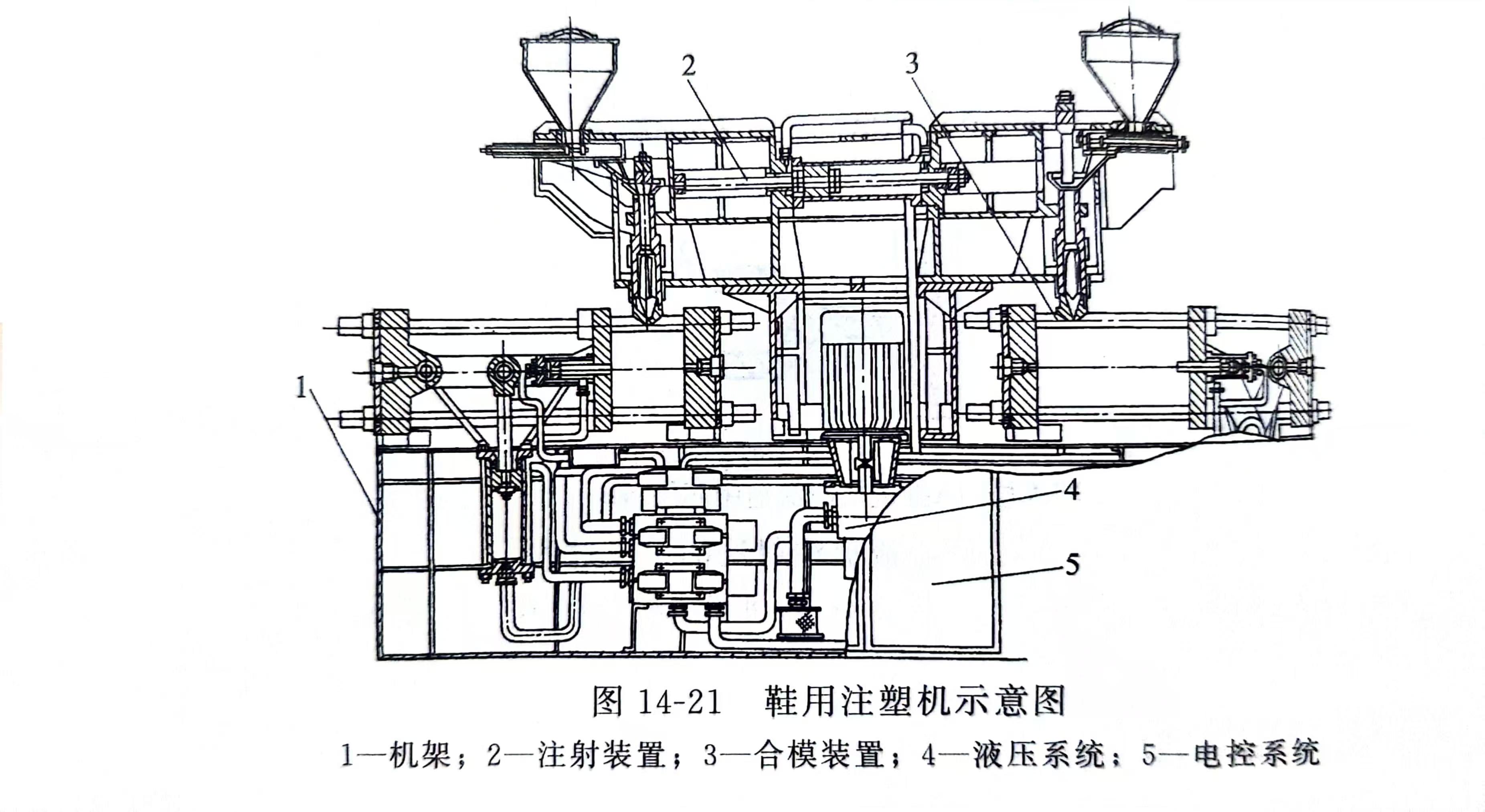 单色结帮鞋用注塑机基本结构组成如图14-21所示。