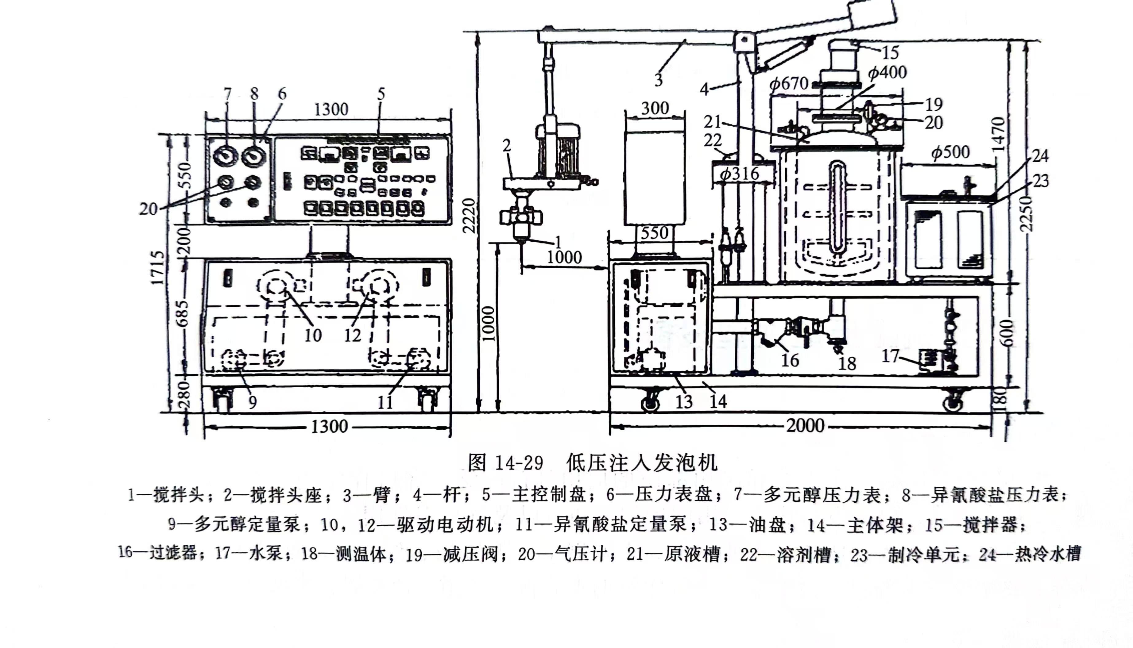 低压注入发泡机如图14-29所示,主要由供料系统,泵出、混合及注射系统组成。在供料系统中主要是在原液槽及熔剂槽上安装有定量泵单元和原液温度调节单元。两槽附带有电