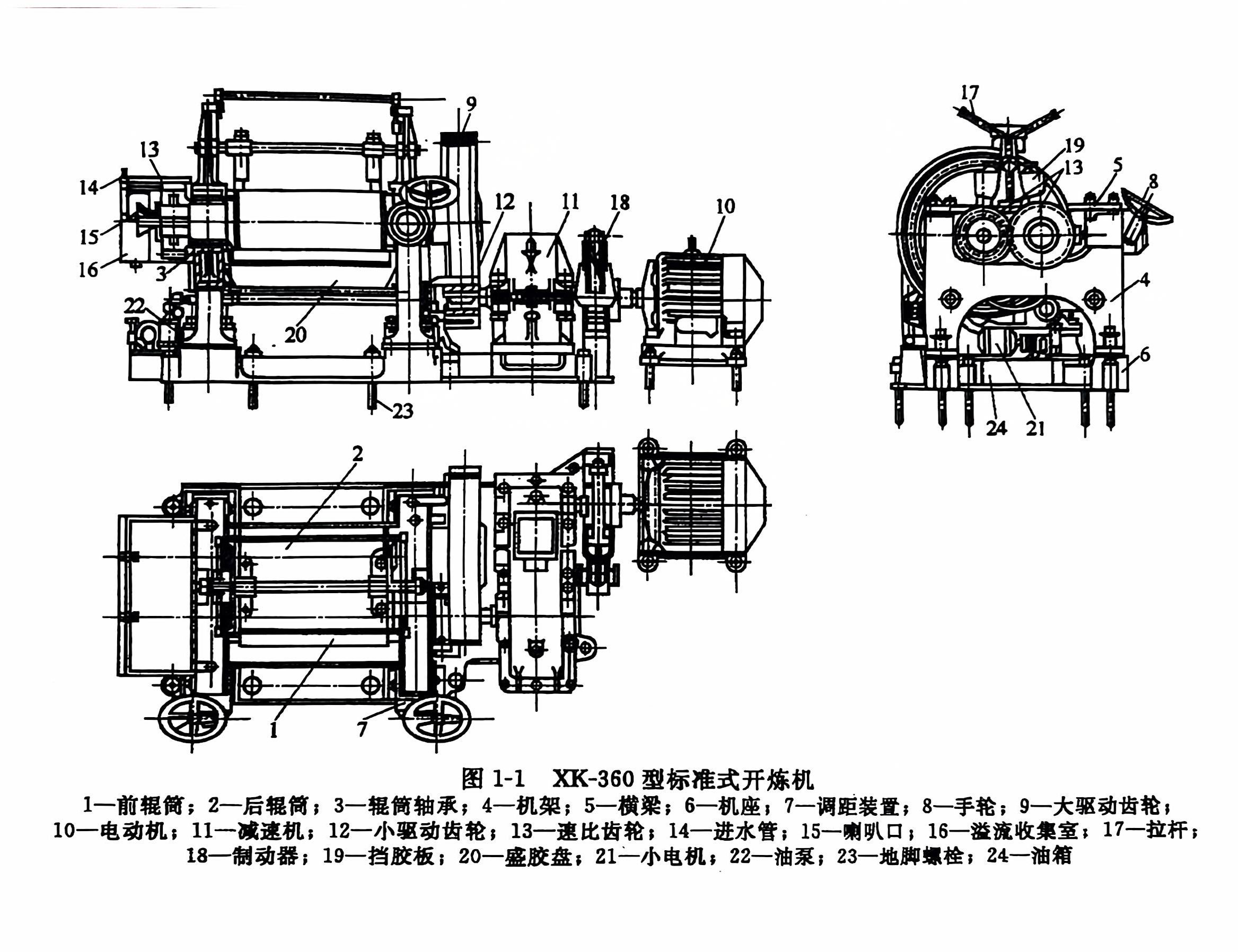 标准式开炼机 图1-1是目前生产上广泛使用的一种规格为 XK-360型标准式开炼机的整体结构。其主要工作部分为两个平行安放且相对回转的空心银筒1和2,每个辊筒的两边轴颈上都装有辊筒轴承3,辊筒轴承则装在机架4上。机架用螺栓固定于机座6上,其上部与横梁5相连接。前辊轴承可借助于调距装置7的作用,在机架上作水平移动,以调节前后辊之间的距离(辊距),控制胶片的厚度。后辊轴承则由螺栓固定于机架上以减少炼胶时后辊轴承的晃动。