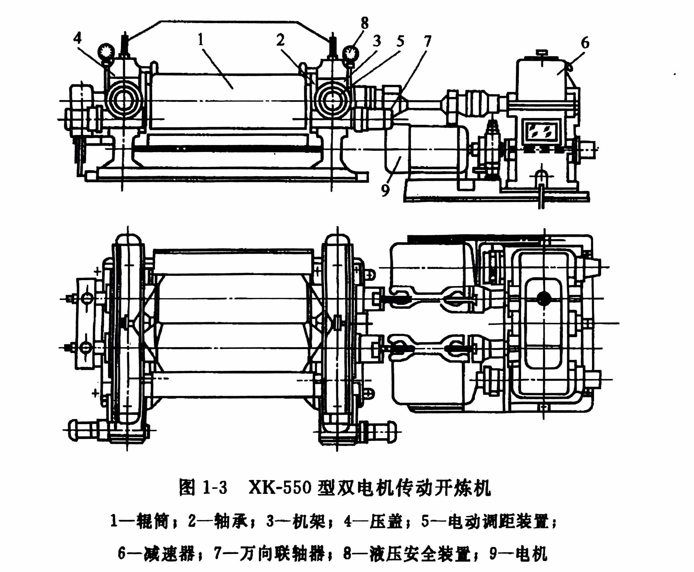 双电机传动开炼机 如图1-3所示,这是一台规格为XK-550的这种结构形式的开炼机还装有电动调距装置5和液压安全装置8。辊筒轴承2采用大型自动调心滚子轴承或滑动轴承。特点是取消了速比齿轮和大小驱动齿轮。采用圆弧齿轮减速器寿命长,结构紧凑,效率高,维护方便。缺点是制造费时,成本高。