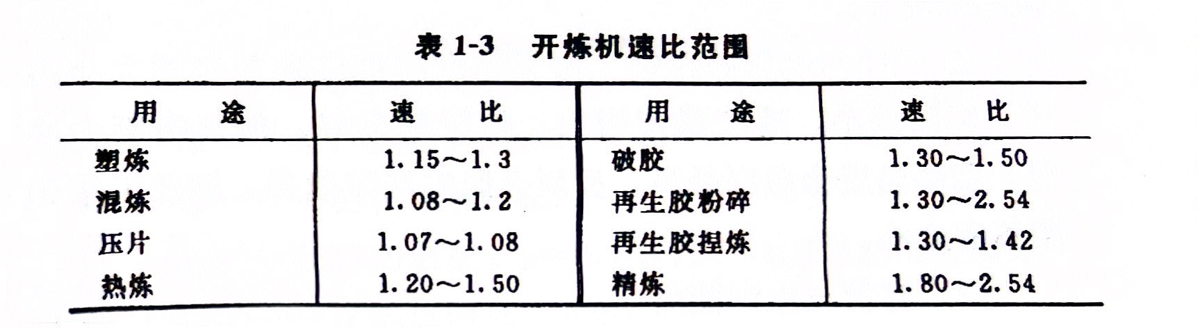 为了操作方便和安全起见,前辊筒线速度一般比后辊筒线速度要小,即f>1。开炼机辊筒的速比,是根据加工胶料的工艺要求来选取的,它是设计开炼机的重要参数之一。不同用途的开炼机,要求的辊简速比是不相同的,开炼机速比范围见表1-3。