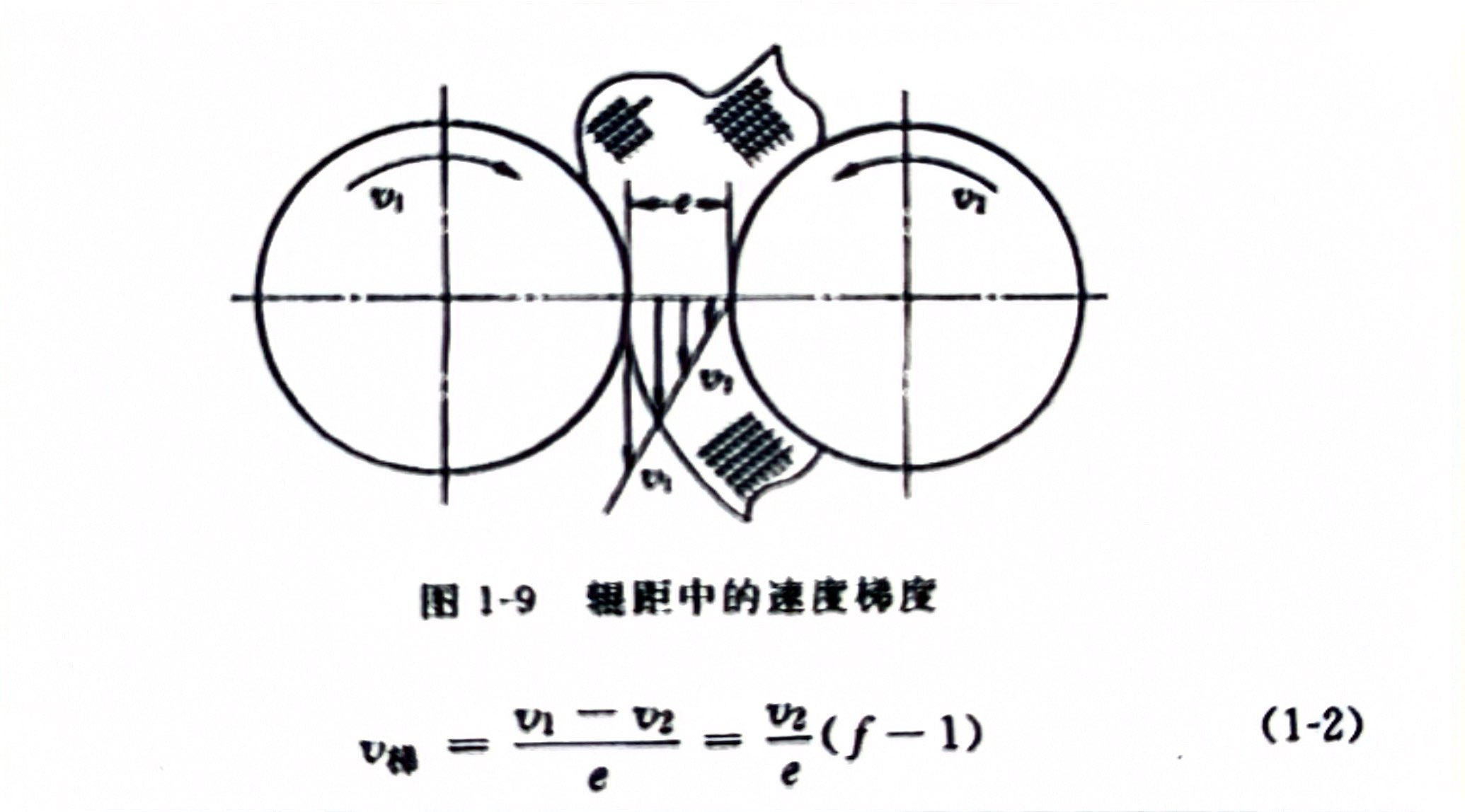 速度梯度由于两辊筒表面的线速度不一致,故胶料在辊距中便产生速度梯度,如图1-9所示。与转速较快的后辊筒表面接触的胶料其通过辊距的速度较快,而与前辊筒表面接触的胶料则通过辊距的速度较慢,这样在辊距e的范围内就出现速度梯度,其数值大小可按式(1-2)计算:
