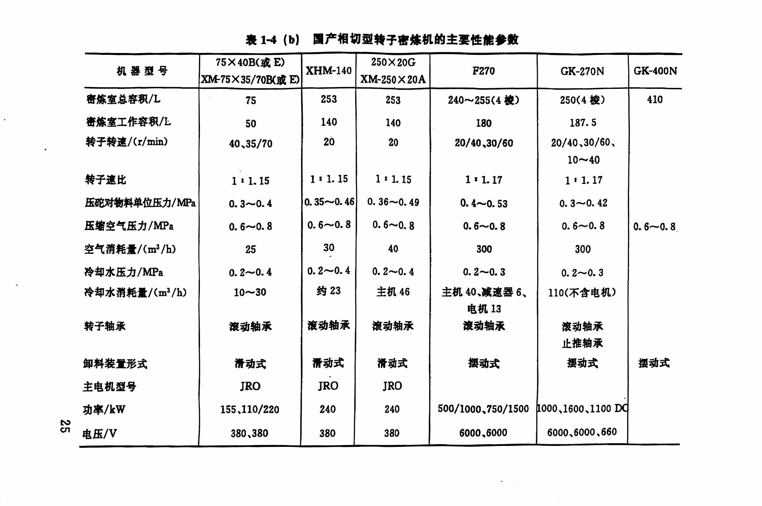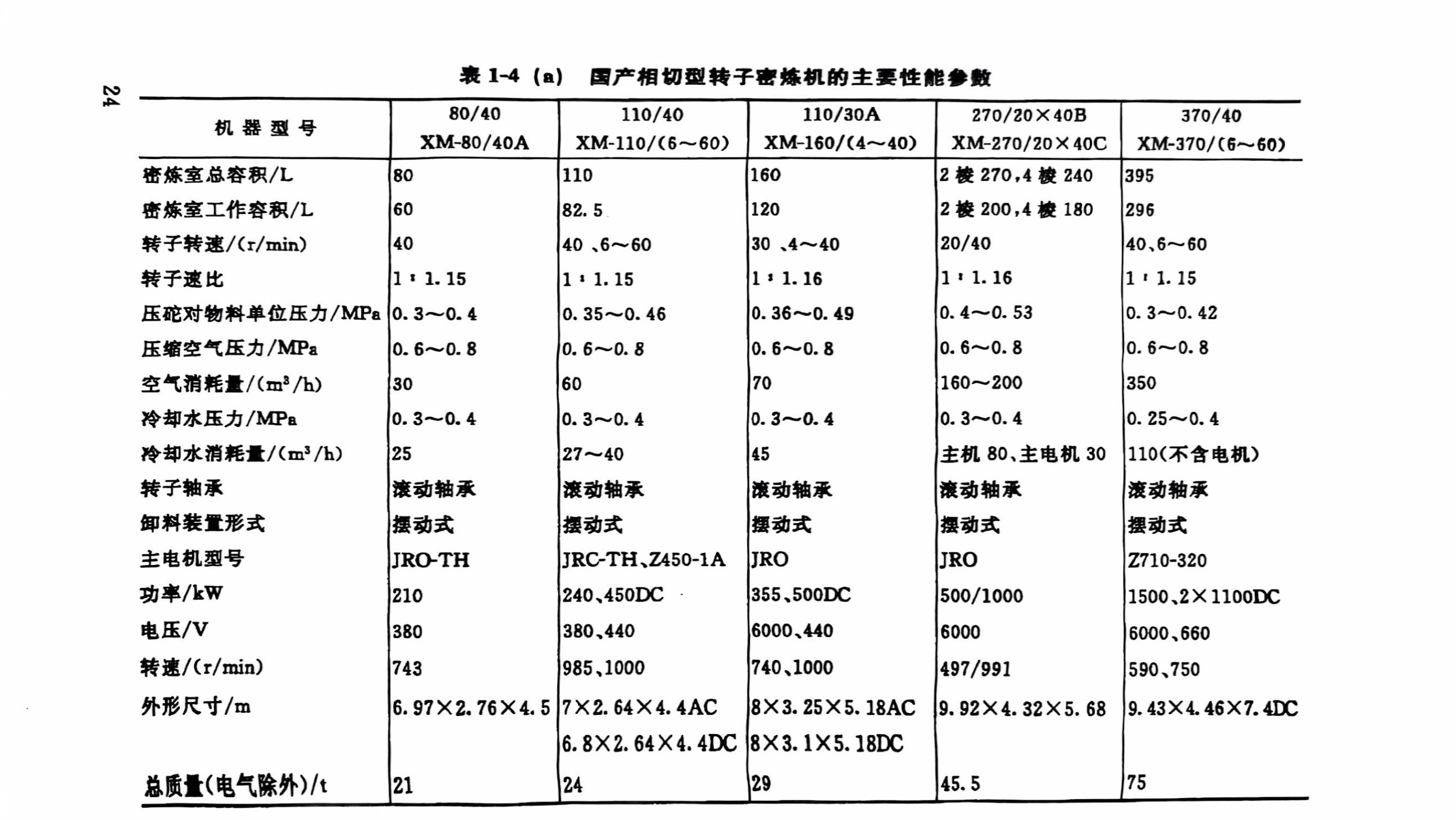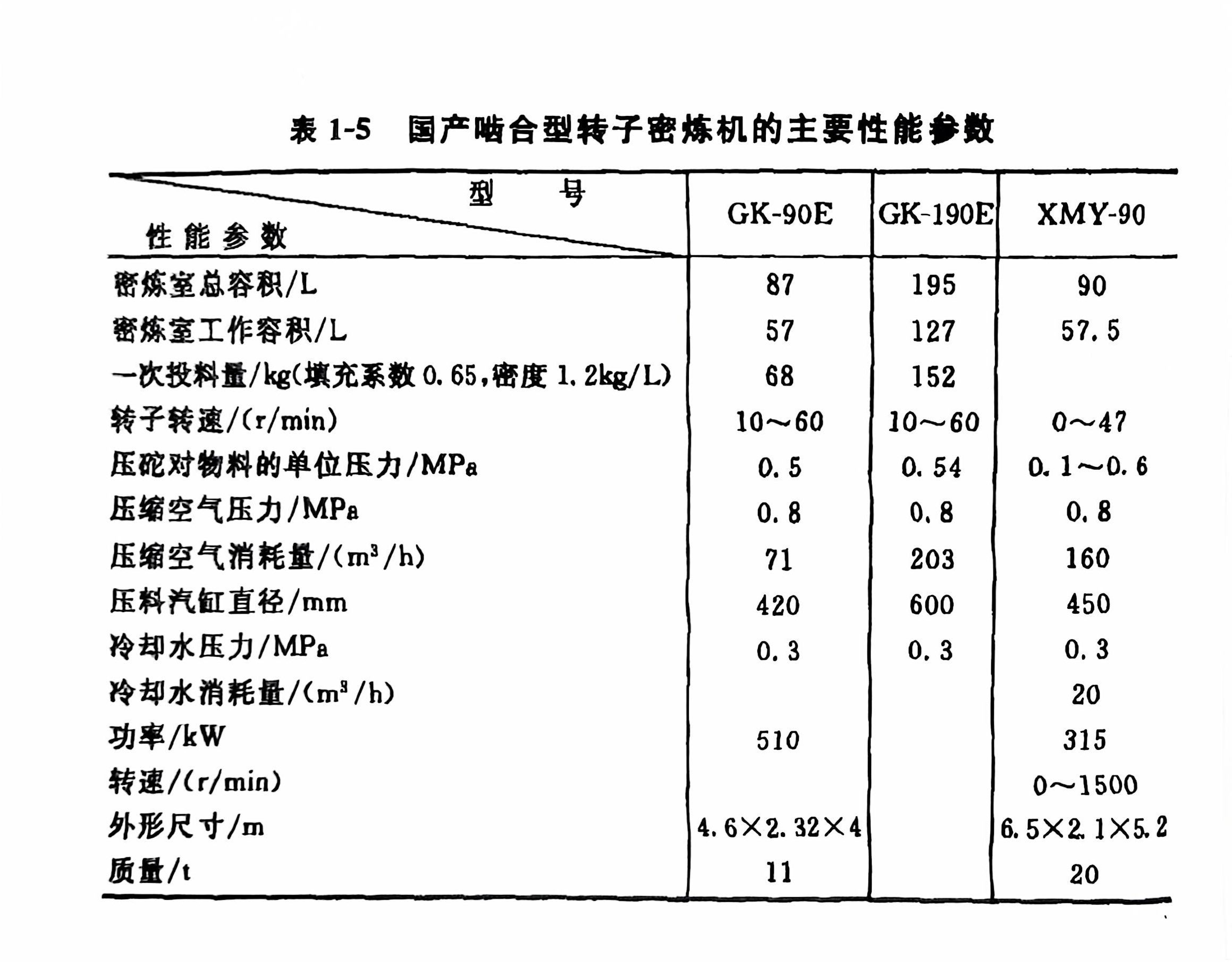 又如XM-270/20X 40型,它表示混炼室总容量为270L、双速(20r/min、40r/min)橡胶类密炼机。如果前面冠以的符号是X(S)M时,S表示塑料类,就说明此密嫁机既适用于橡胶,也适用于塑料。表1-4、表1-5所示分别为国产相切型和啮合型转子密炼机的技术特征。