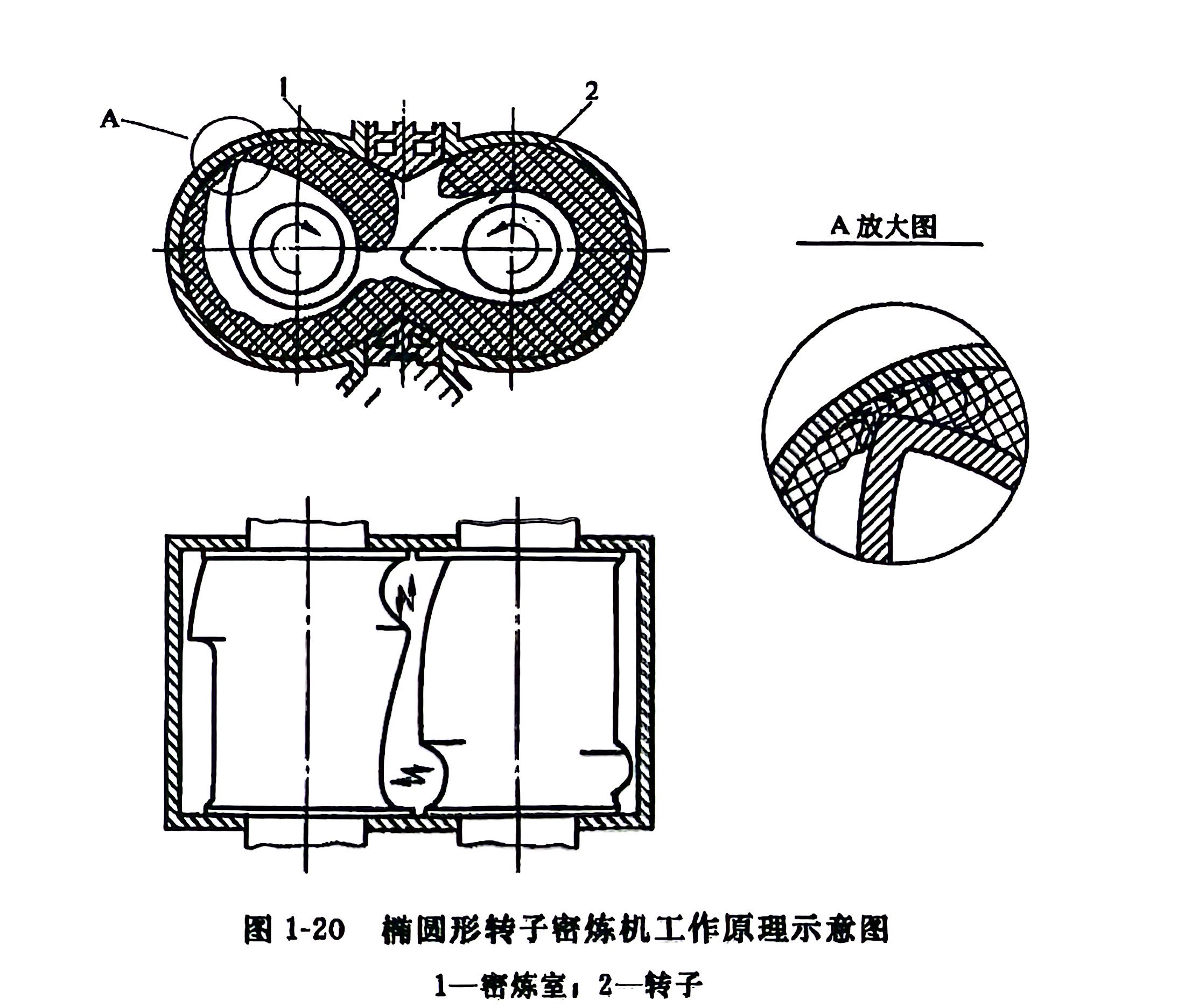 密炼机在混炼过程 在混炼室内,生胶的塑炼或混炼胶的混炼过程,比开炼机的塑炼或混炼要复杂得多。胶料在混炼室内不仅在两个相对回转的转子间隙中,而且在转子与混炼室壁之间的间隙中,以及转子与上、下顶栓的间隙中受到不断变化的前切挤压作用,促使胶料产生剪切变形而进行捏炼。图 1-20 是椭圆形转子密炼机工作原理示意图。