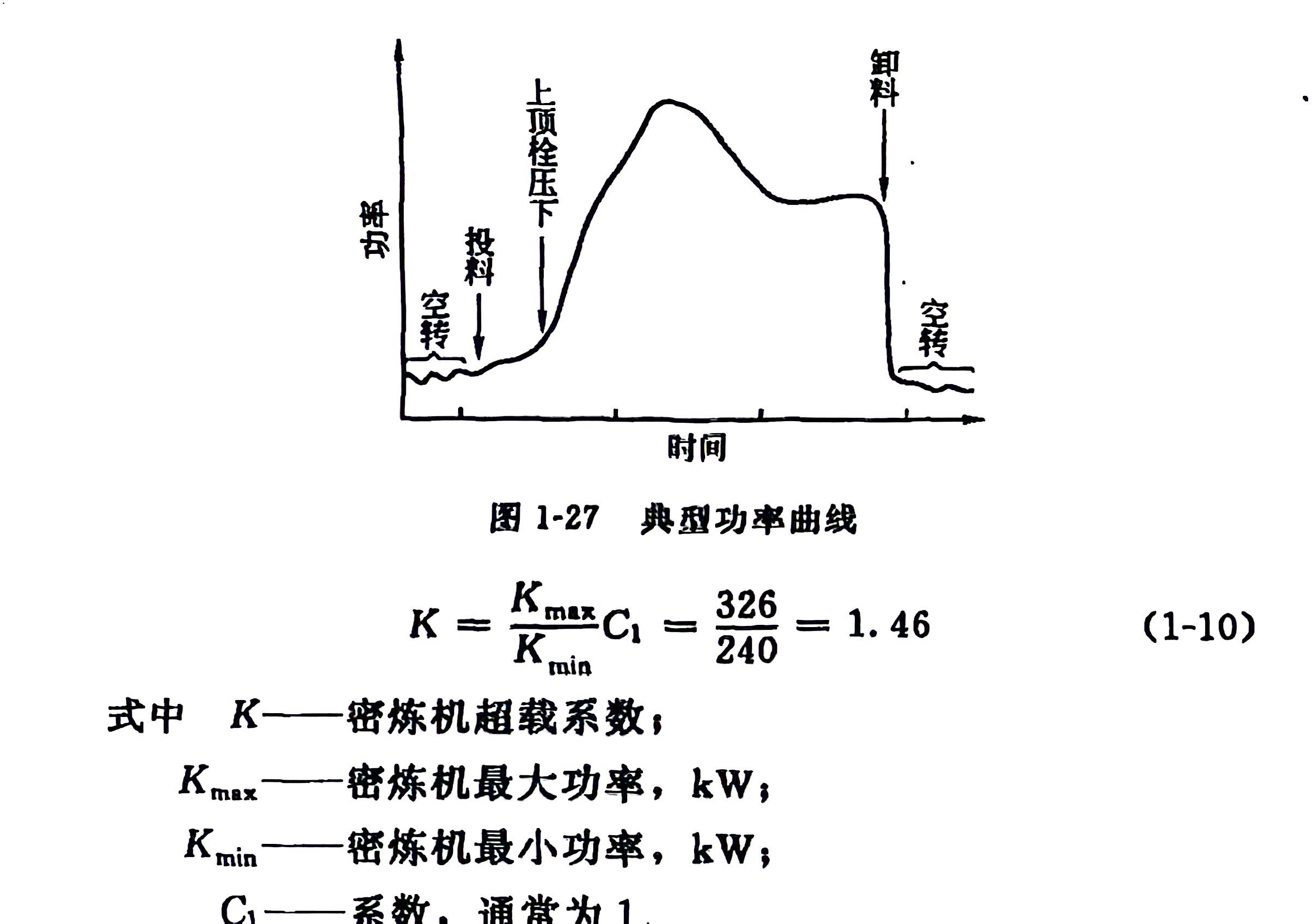 图1-27 是典型功率曲线,从图 1-26 与图 1-27 可见,在炼胶过程中,随着配合剂的加入,在大约1.5~2min的过程中有强烈的捏炼过程,因而出现高峰负荷。当功率增长达到最大限度后,随着胶料温度的升高,配合剂也进一步分散,功率即逐渐下降。不同的工艺条件不但最大功率不同,就是功率消耗曲线也是不同的。对 XM-250/20 型密炼机来说,在整个炼胶过程中,平均功率约为 228kW,但最大功率为 326kW,密炼机所用电动机的额定功率为 240kW,其超载系数如下式所示: