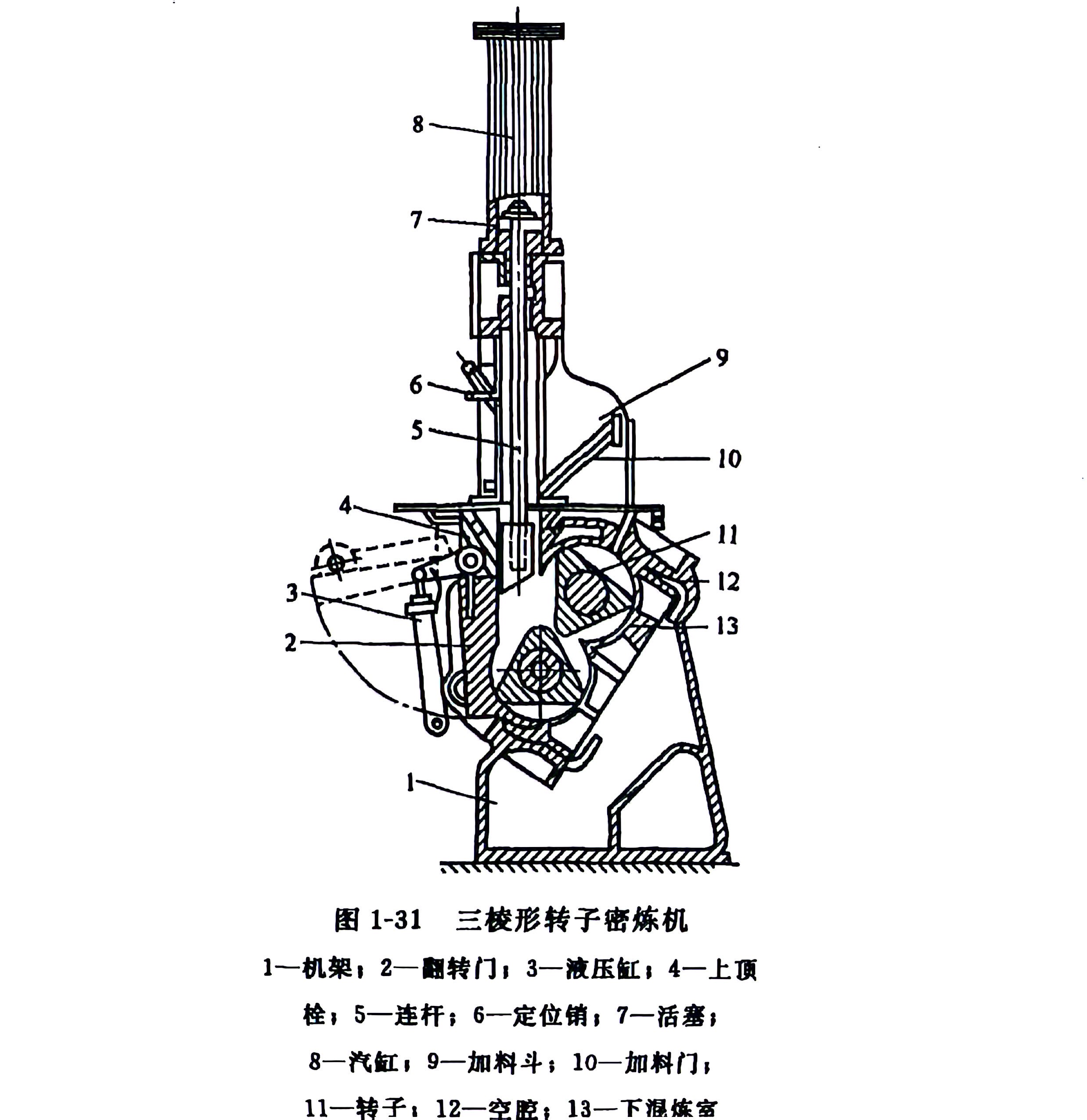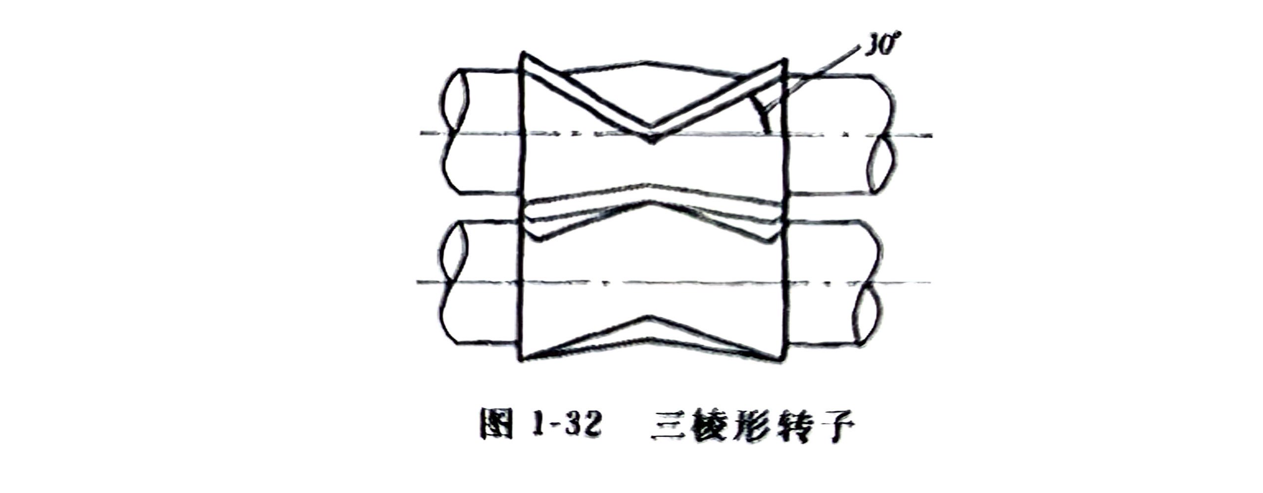三棱形转子密炼机如图1-31所示,转子的工作部分横截面为三角形,每个转子的三个凸棱沿工作部分的圆周前进,相遇于转子中部形成为约120°的折角(见图1-32),凸棱与轴线的夹角为30°。这种形式的转子由于凸棱的排列及构造左右对称,不能使胶料产生轴向移动,仅靠转子及混炼室间对胶料的剪切挤压作用,故炼胶效率低,目前应用较少。因其炼胶生热较少,主要用于对高温敏感的胶料。