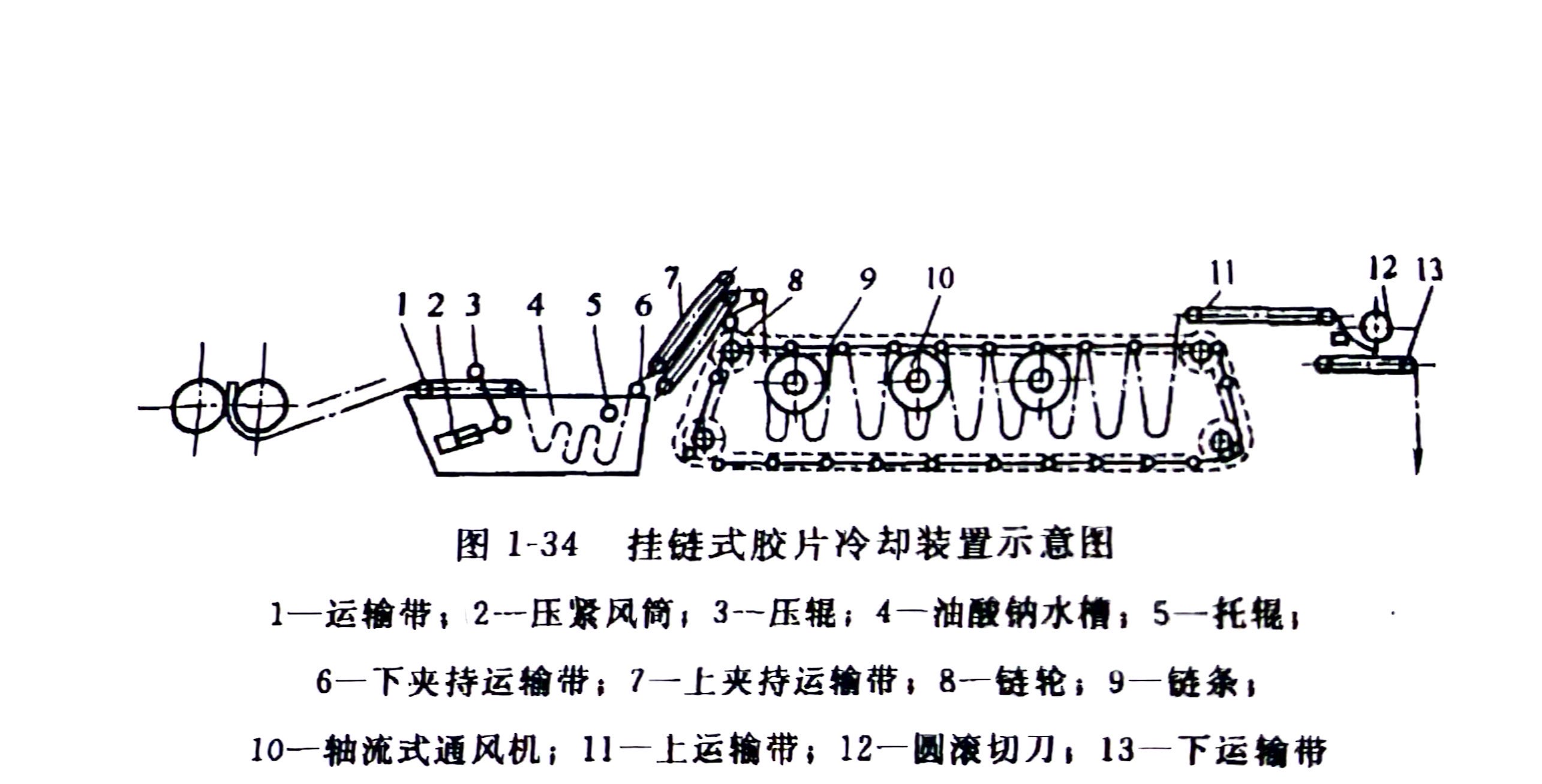 胶片冷却装置是将从压片机上引下来的胶片连续进行涂隔离剂,冷却吹干和切片等一系列作业的机械操作装置。目前采用的有运输带式吹风冷却装置及挂链式的吹风冷却装置。因后者冷却效果好,且装置较短,故得到普遍采用,下面作简单介绍。挂链式胶片冷却装置结构示意图见图1-34所示,它由浸泡槽、夹持带、挂链和切刀等部分组成。