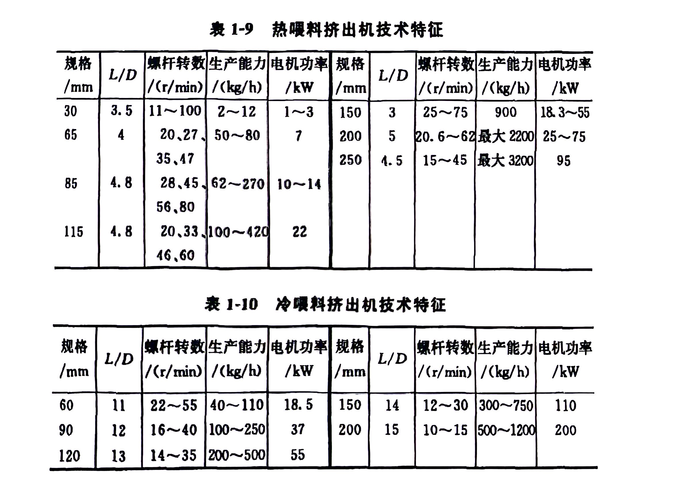 (2)技术特征热喂料挤出机技术特征与冷喂料挤出机的技术特征分别见表1-9及表1-10所示。