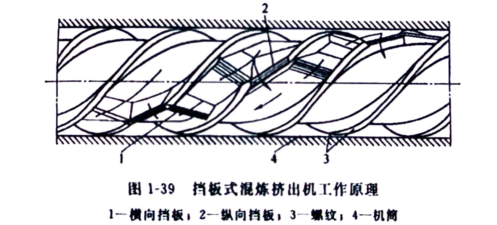 挡板式混炼挤出机主要工作部分是一个带有横向挡板和纵向挡板的多头螺杆,挡板式混炼挤出机工作原理如图 1-39 所示。胶料在挤出过程中多次被螺纹和挡板进行分割、汇合、剪切、搅拌,完成混合作用。横向挡板垂直于相邻两个螺纹面,它阻挡胶料的流动,对胶料产生较大的剪切作用。连接两个螺纹的挡板称纵向挡板,它使胶料产生分流作用,使胶料不断分割、混合。纵向与横向挡板的连接点即为分流点。在挤出过程中胶料各质点运动的行程不同,但它们经过纵向和横向挡板数却是相同的。因此所受的机械剪切、混合作用是相同的,故混炼的质量均匀。另一方面,剪切作用最大发生在靠近机筒壁墅处,传热效果好,胶料升温不大、操作稳定。