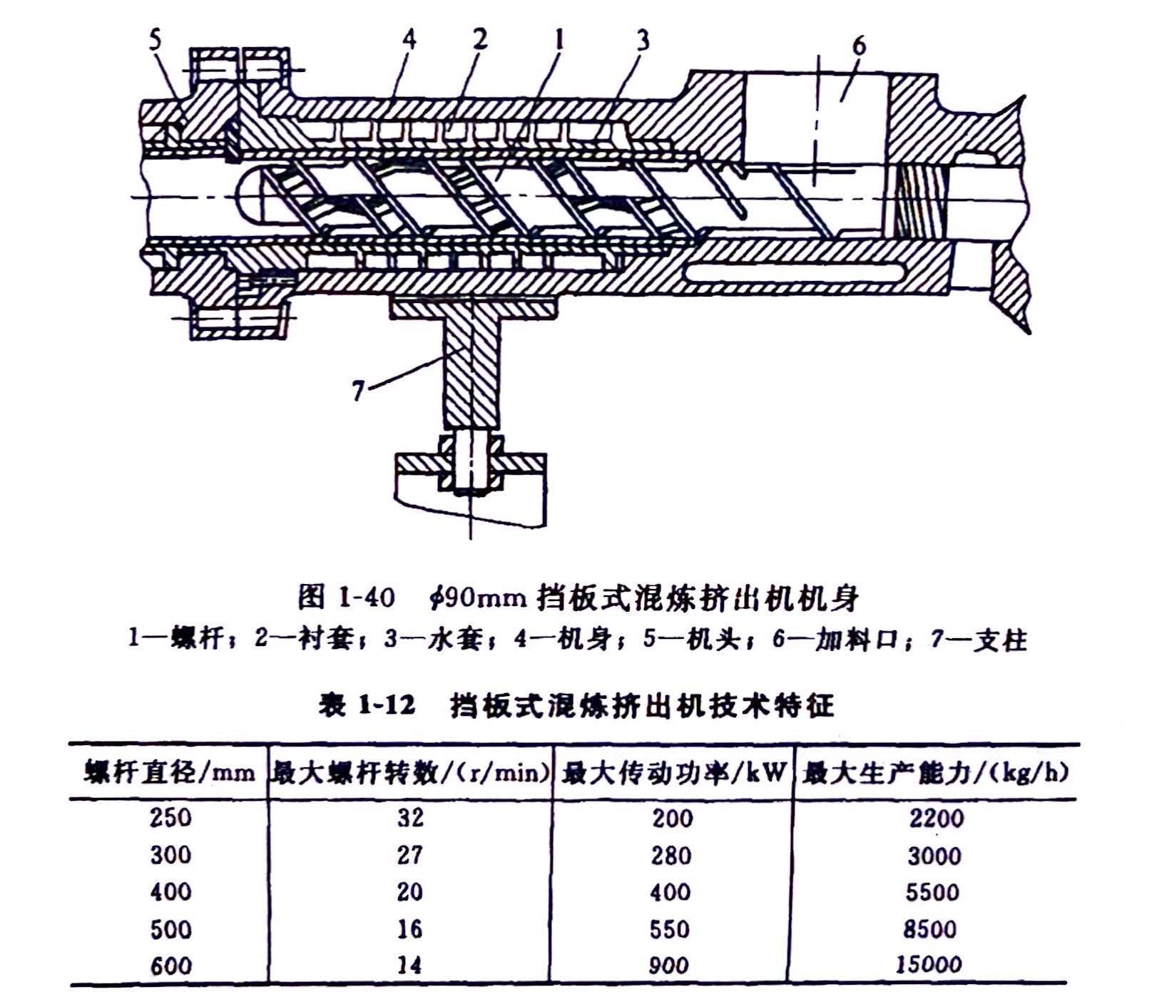 图1-40为$90mm挡板式混炼挤出机机身工作部分。表1-12为挡板式混炼挤出机技术特征。