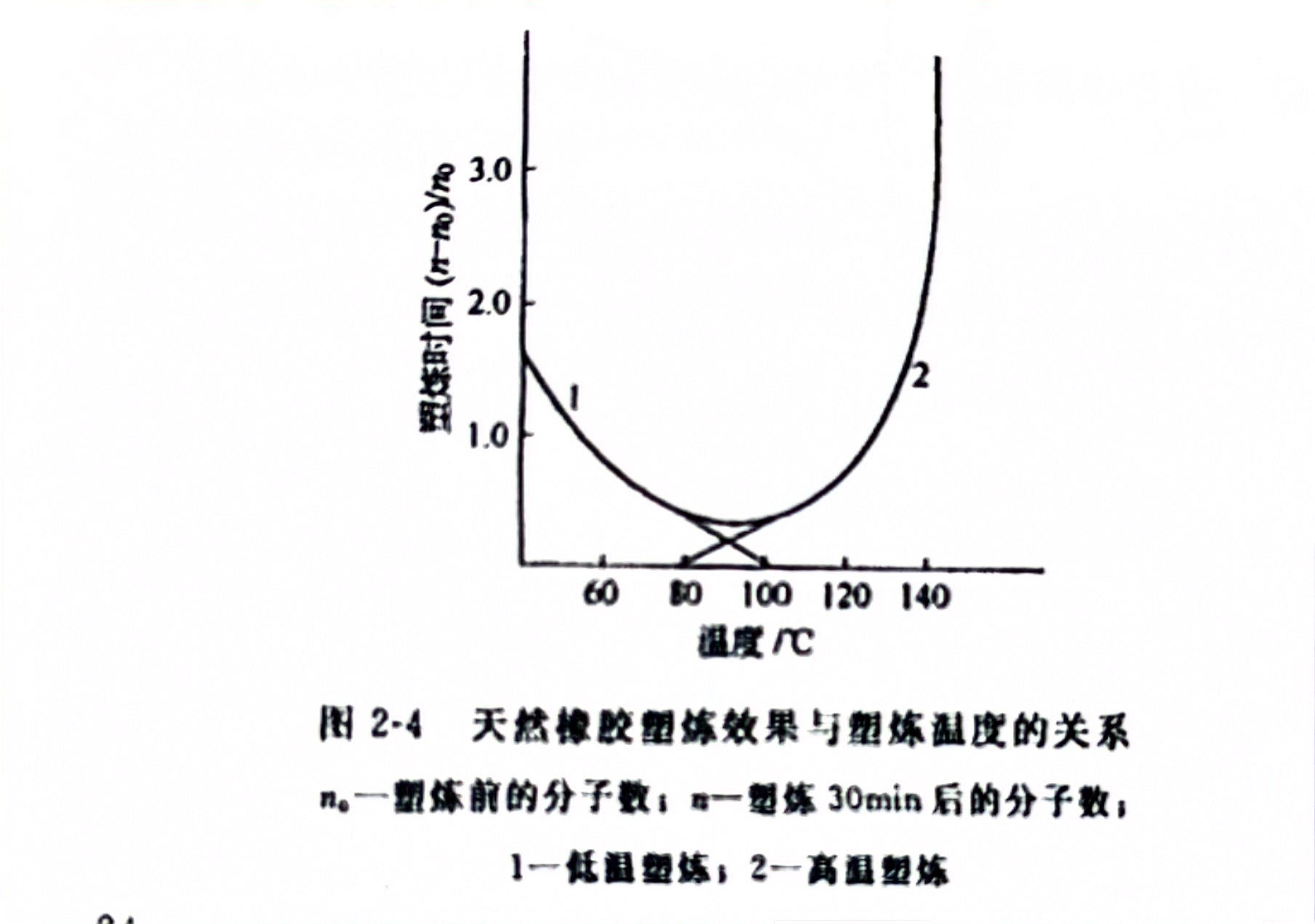 温度对生胶的塑炼效果有着重要的影响,不同温度范围对塑炼的作用是不同的。实验表明,天然橡胶在50~150℃范围内塑炼 30min 后,得到一条近于U形的曲线,天然橡胶塑炼效果与塑炼温度的关系如图2-4所示。从图2-4 看出,天然橡胶塑炼过程所得 U形曲线可以认为是由两条不同曲线组合而成,并代表两个独立过程,在最低值附近相交。其中1线代表低温塑炼,2线代表高温塑炼。在低温塑炼阶段,由于橡胶较硬,受到的机械破坏作用较剧烈,较长的分子链容易为机械应力所扯断。而此时氧的化学活泼性较小,故氧对橡胶的直接引发氧化作用很小。所以,低温时,主要是靠机械破坏作用引起橡胶分子链的降解而获得塑炼效果。随着塑炼温度的不断升高,橡胶由硬变为柔软,分子链在机械力作用下容易产生滑动而难以被扯断,因而塑炼效果不断下降,在 110℃附近达到最低值。此时由氧直接引发的氧化破坏作用也很小。但是当温度超过110℃以上再继续升高时,虽然机械破坏作用进一步降低,但由于氧的自动催化氧化破坏作用随着温度升高而急剧增大,橡胶分子链的氧化降解速度大大加快,塑炼效果也迅速增大。因此,低温塑炼与高温塑炼的机理是不同的。低温塑炼时,主要是由机械破坏作用使橡胶分子断链;高温塑炼主要是由氧的氧化裂解作用使橡胶分子链降解。由于高温塑炼时,氧化对分子量最大和分子量最小部分的作用是相同的,所以高温塑炼在平均分子量变小的同时,并不发生分子量分布变窄的情况,塑炼后,分子量很低的级分可能较多。此外,高温塑炼时,机械的作用主要是翻动和搅拌生胶,以增加生胶和氧接触的机会,从而加快橡胶的氧化裂解过程。