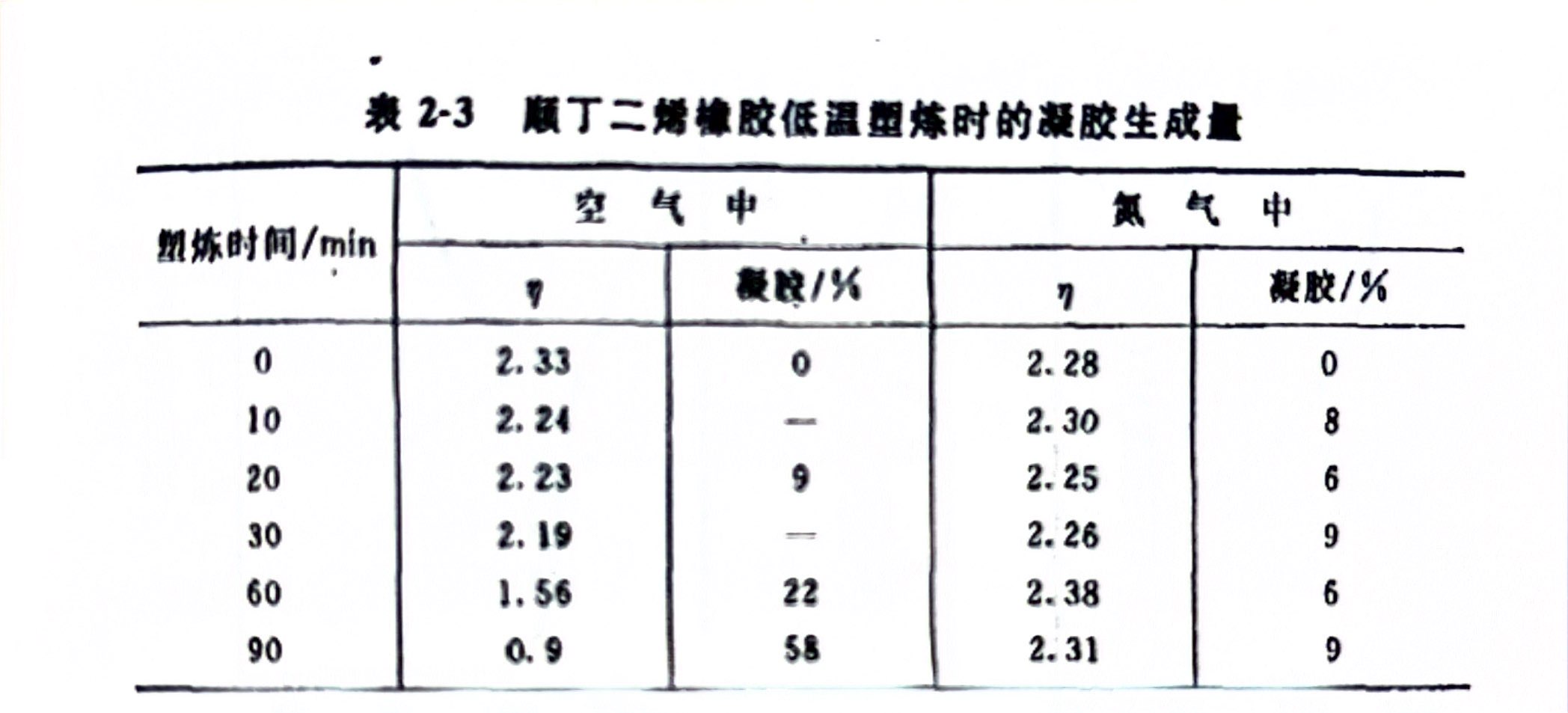 聚丁二烯橡胶在空气中塑炼时凝胶生成量比在氮气中塑炼时为多。Morton用顺式含量为98%的顺丁橡胶,抽出抗氧剂后,分别在空气和氮气介质中进行低温塑炼,测定凝胶生成量,顺丁二烯橡胶低温塑炼时的凝胶生成量如表 2-3 所示。