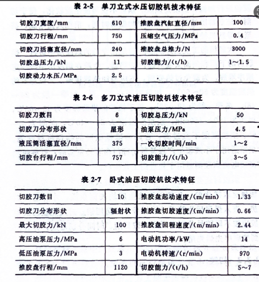 生胶加温以后从烘胶房取出用切胶机切成小块。切胶机是完成这一工序的主要设备。切胶机专供切割生胶之用。有多种类型,有单刀和多刀、立式和卧式之分,多刀切胶机比单刀切胶机的生产能力高,而卧式切胶机比立式切胶机更易于组织联动作业线,但立式切胶机占地面积比卧式切胶机要小。立式切胶机适用于中小规模工业生产及合成橡胶切胶使用,卧式切胶机适用于大规模工业生产。各类切胶机的技术特征如表2-5、表2-6、表2-7所示。