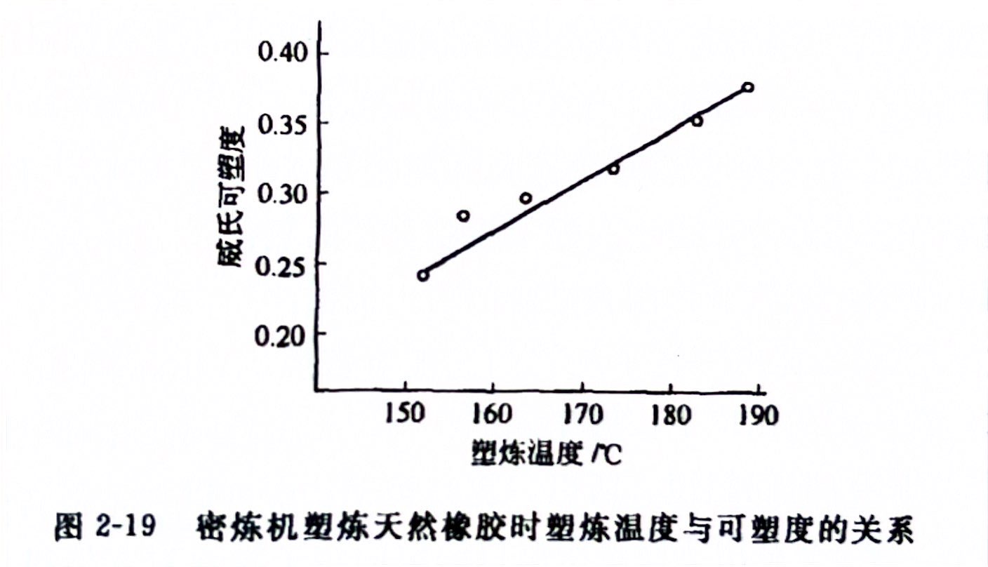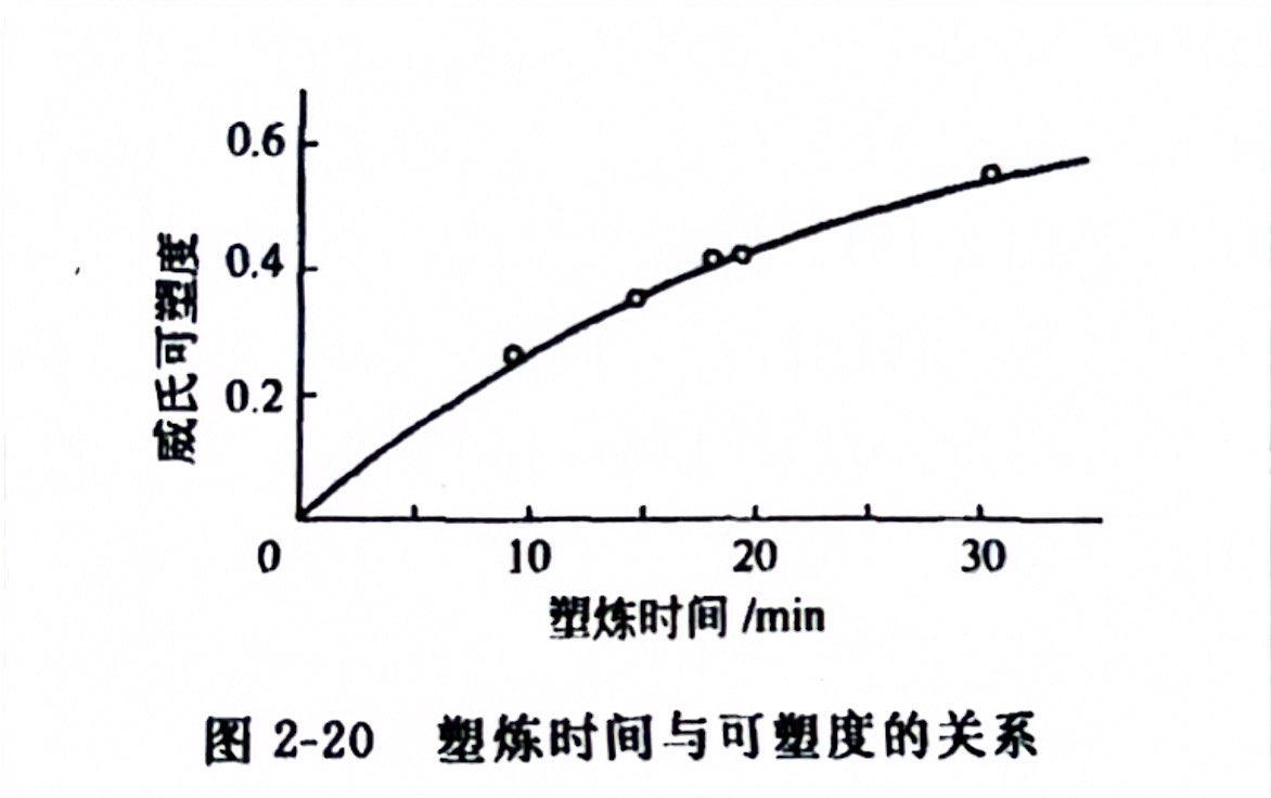 密炼机塑炼温度一定时,塑炼胶料可塑性的变化与塑炼时间的关系如图 2-20 所示。在塑炼过程的初期,可塑性随塑炼时间的延长而直线上升。但经过一定时间以后,可塑性的增长速度减缓。这是因为,随着塑炼时间的延长,密炼室内的氧逐渐减少,致使氧化裂解反应逐渐减慢;另外,随着塑炼过程的进行,密炼室中充满了大量的水蒸气和低分子挥发气体,这亦阻碍了橡胶与周围空气中氧的接触,使生胶的氧化裂解反应减慢。因此,随着塑炼过程的进行,可塑性的增长速度逐渐