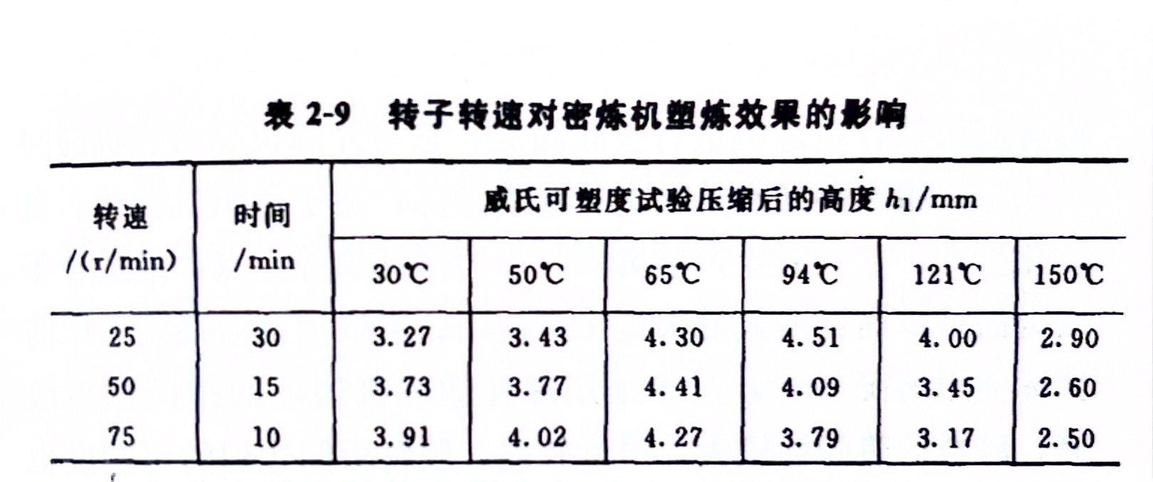 ③转子速度 转子旋转的速度对密炼机塑炼效果影响很大。在一定的温度下,转子速度越快,胶料达到同样可塑度所需要的塑炼时间越短。所以,提高转子速度可以大大提高生产效率。表2-9是用实验室密炼机测定的转子转速对密炼机塑炼效果的影响。