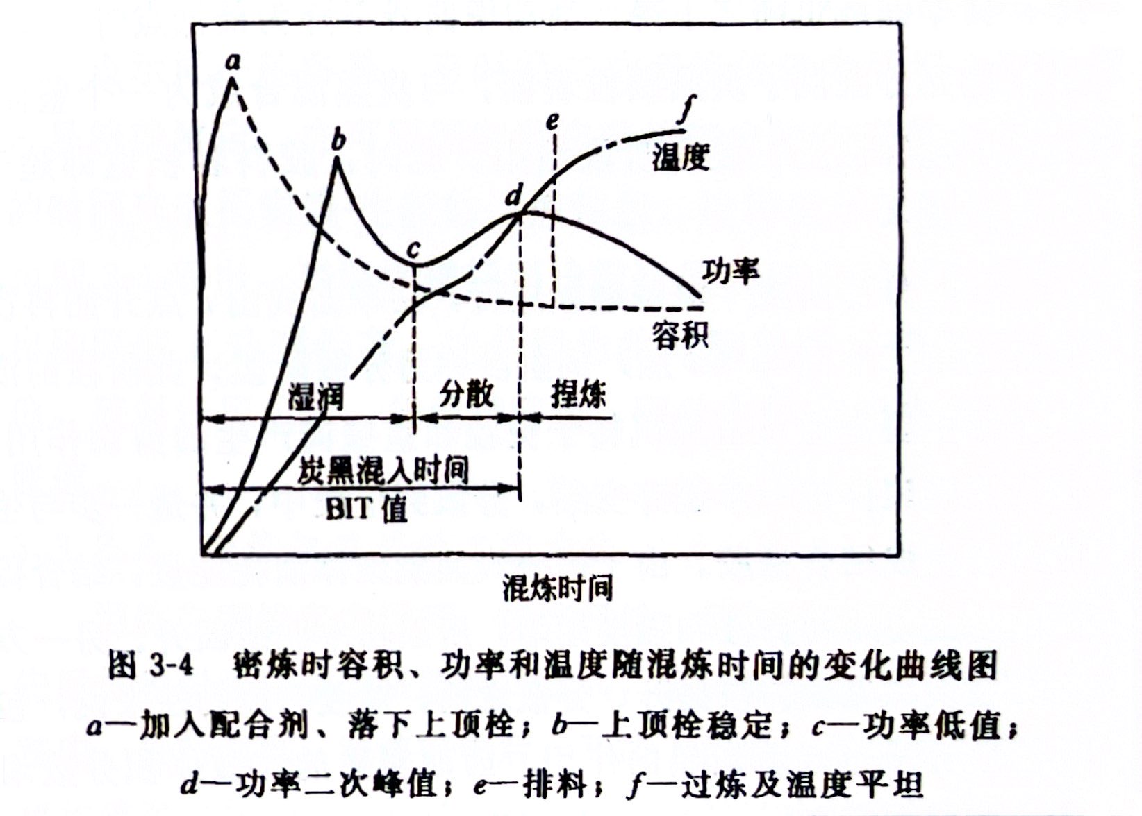 由图3-4可见,密炼机混炼历程随混炼时间的增加,功率出现两次峰值(6点及d点),胶料温度不断上升、容积从a点之后不断下降。这就从本质上反映了橡胶和配合剂混合的全过程。