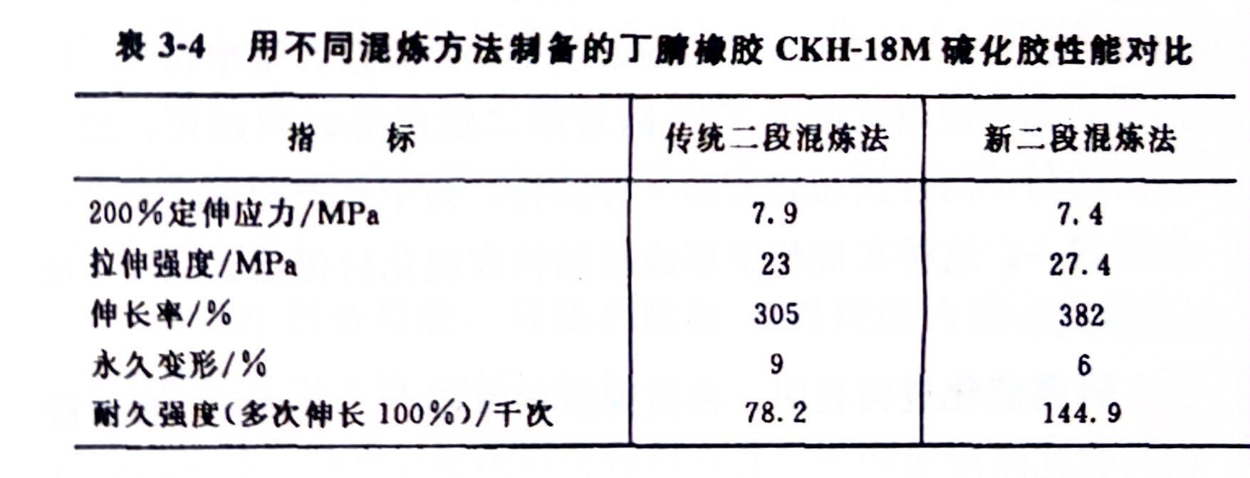 举例:丁腈橡胶CKH-18M混炼胶采用新二段混炼法制备胶料时,母胶中生胶与炭黑 K354配比可为90:100(质量份),用不同混炼方法制备的丁腈橡胶CKH-18M 硫化胶性能对比如表3-4所示。