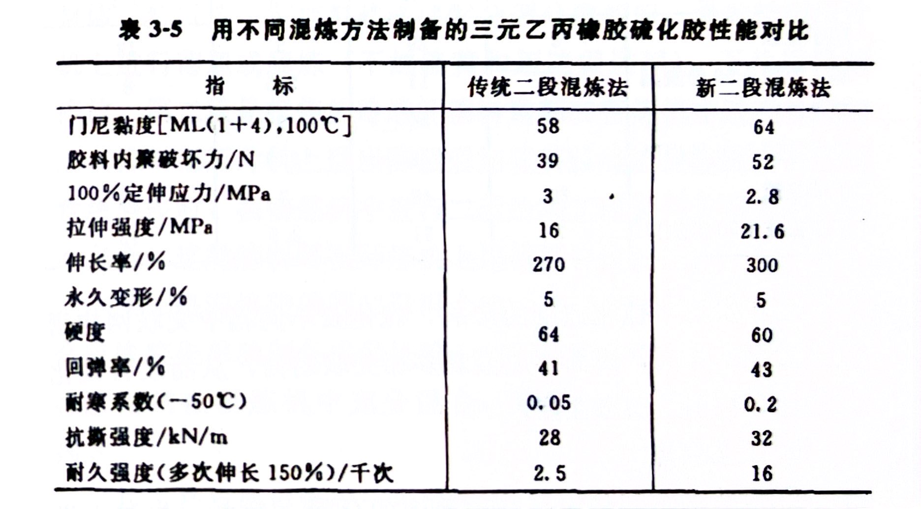 用分段投胶法制备三元乙丙橡胶混炼胶时,第一段母胶中生胶与炭黑N324含量可为100+100(质量份),用不同混炼方法制备的三元乙丙橡胶硫化胶性能对比如表3-5所示。