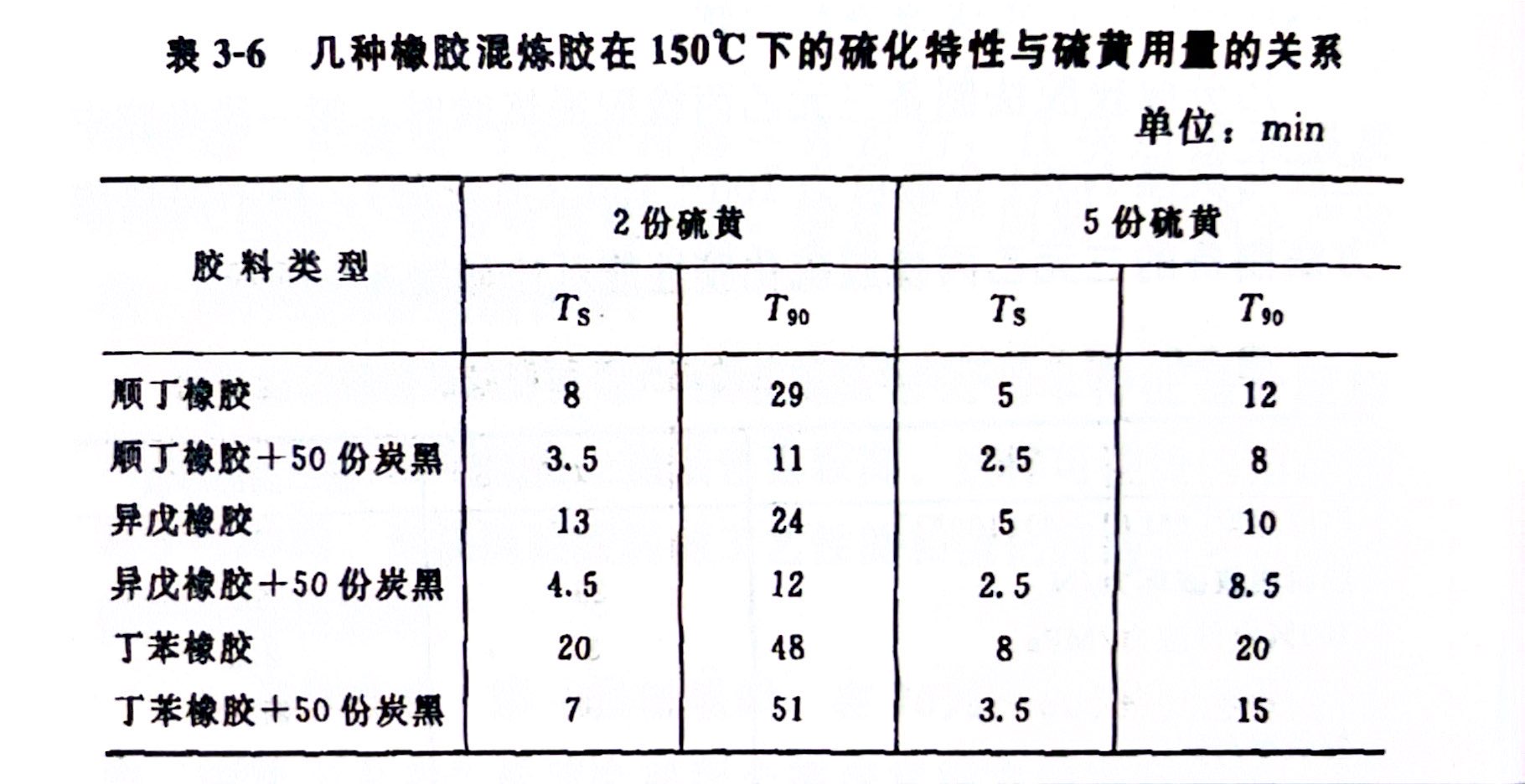 研究硫化进程表明,在微观多相体系中,含炭黑量多的胶相其硫化速度也较大,几种橡胶混炼胶在150C下的硫化特性与硫黄用量的关系如表3-6所示