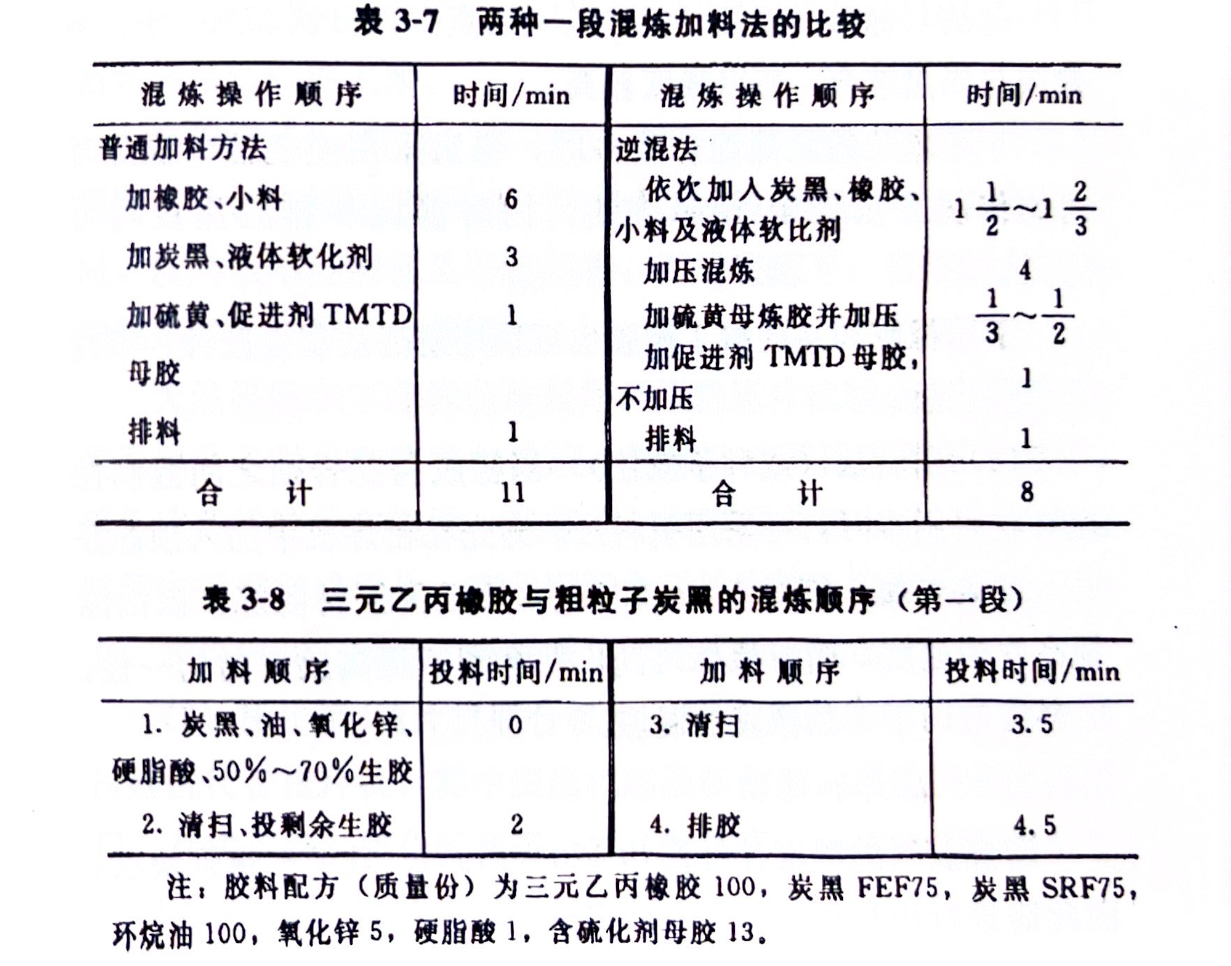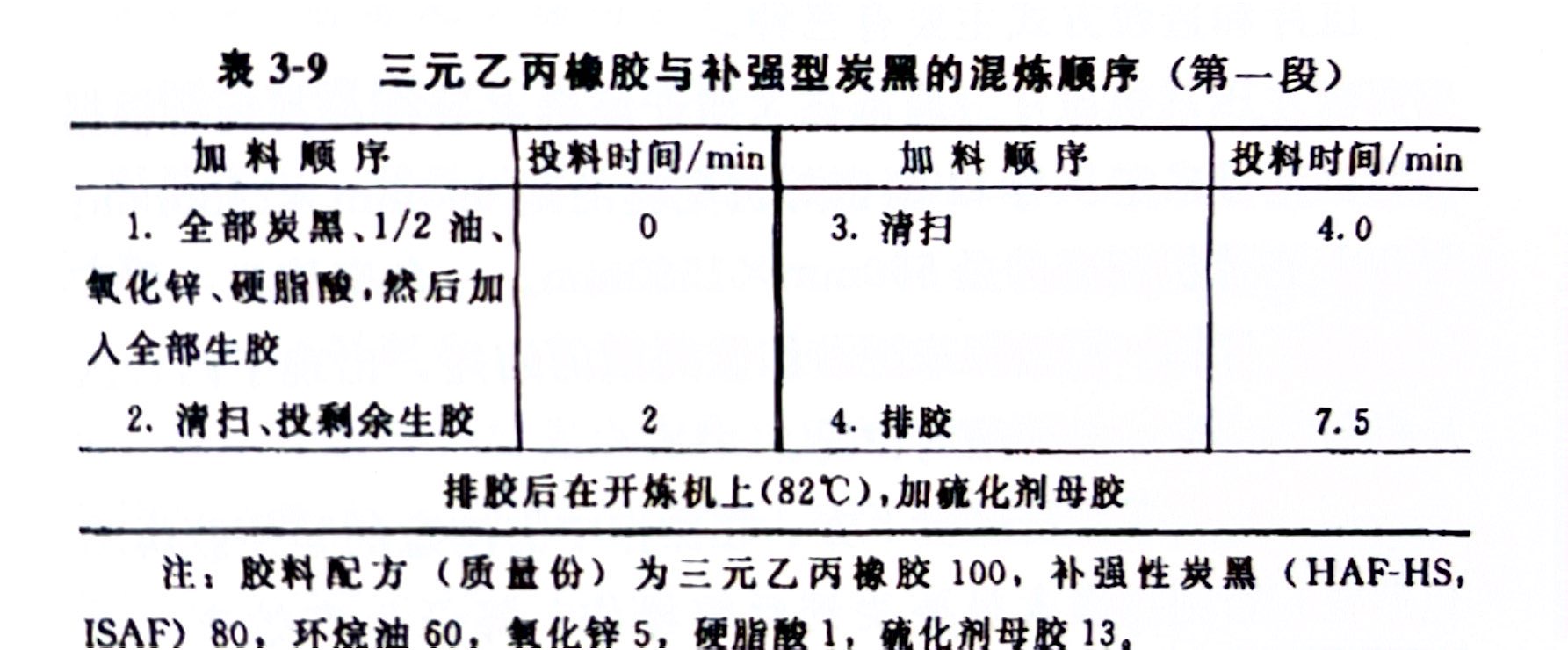 三元乙丙橡胶配用粗离子炭黑时,宜采用第一种方法逆混,其加料顺序如表3-8所示,混炼时间为4.5min。