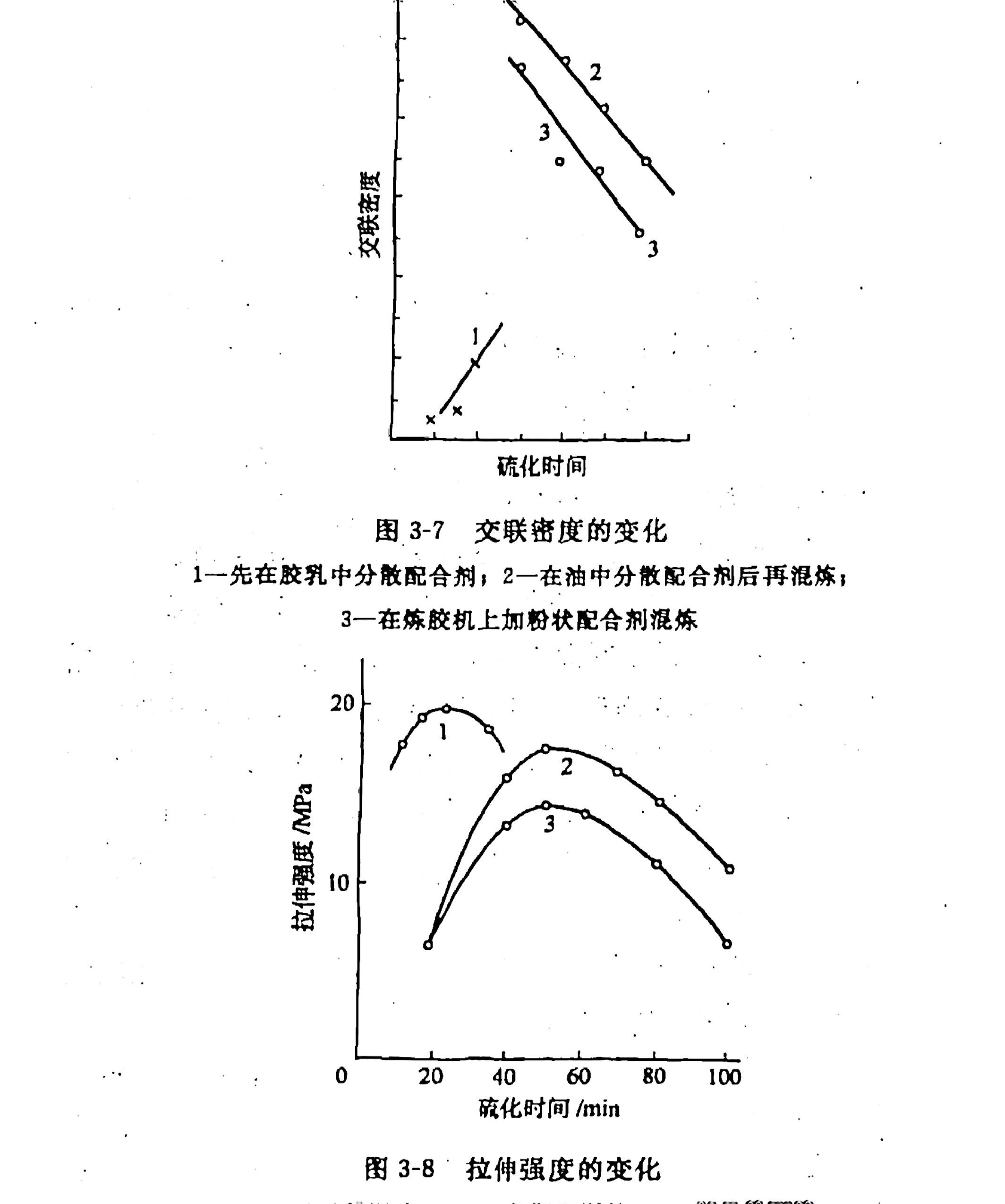 促进剂分散状态对混炼胶硫化和硫化胶处理性能有一定影响。例如采用三种混炼方法制备聚异戊混炼胶(促进剂为CZ):①先在胶乳中分散,再做成干的薄胶片;②把配合剂分散在油中,再用炼胶机混炼;③用炼胶机混炼粉状配合剂。结果表明,分散度以①为最佳,②次之,③为最差。三种胶料交联密度的变化和拉伸强度的变化分别如图3-7和图3-8所示。