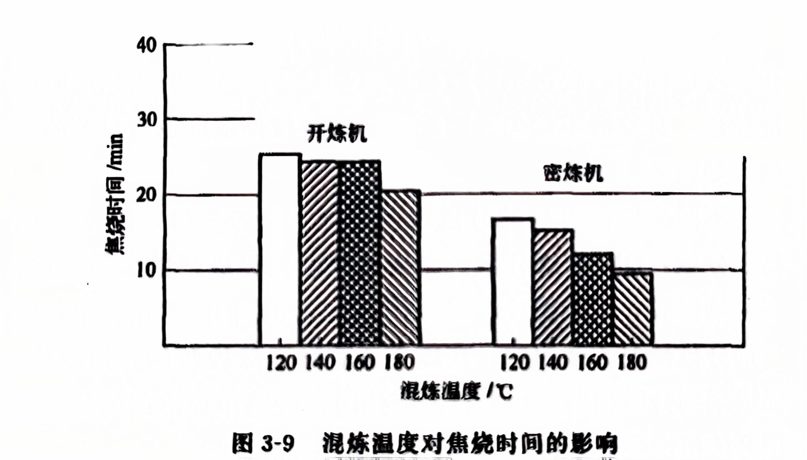 研究表明在不同温度下用开炼机混炼的天然橡胶胎面胶胶料门尼焦烧时间变化不大,达到180CC时才有相当缩短。相反,用密炼机混炼时,温度对焦烧时间影响较大,与开嫁机相比,普遍较短。