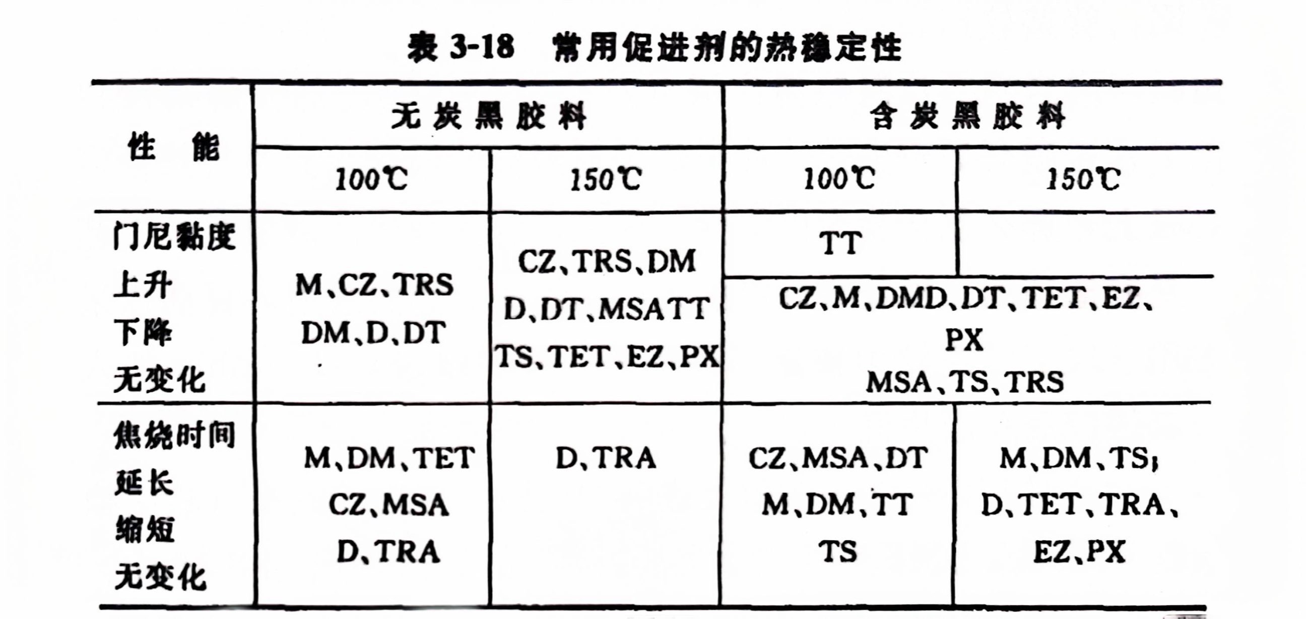今对CZ等12种常用促进剂的热稳定性进行试验(顺丁橡胶分别制成含炭黑和不含炭黑胶料),结果可归纳于表3-18中。