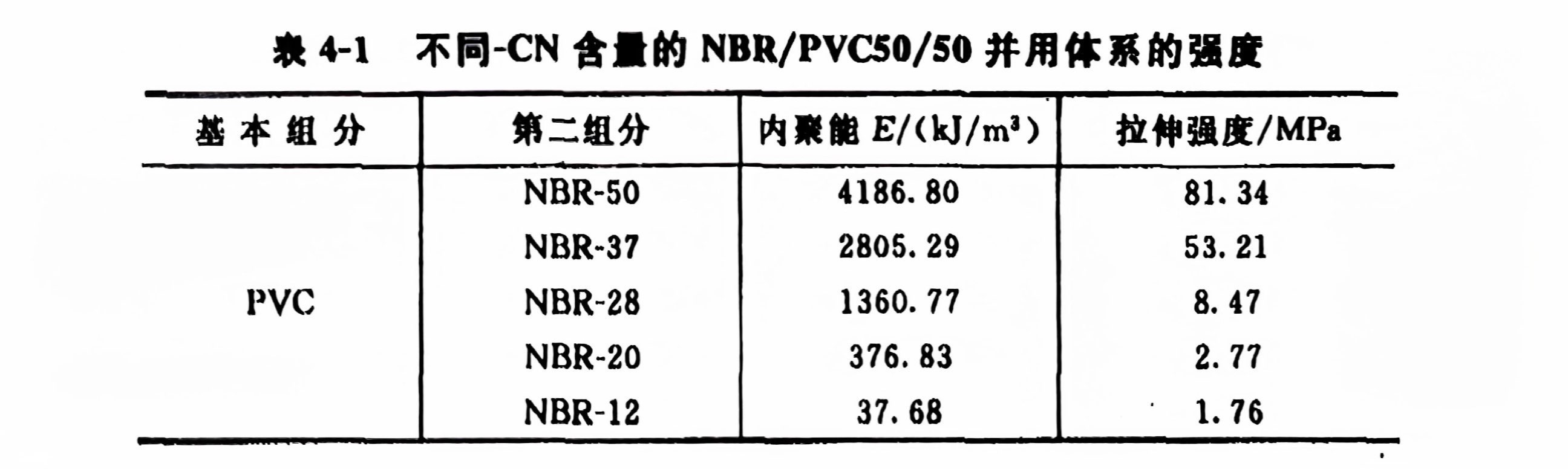 在聚合物并用中,如果并用两组分的溶解度参数&相差越大,则共混物的物理机械性能差别也越大。表 4-1 列出了丁氰橡胶与聚氯乙烯并用时,丁氰橡胶中丙烯氰含量对并用体系强度的影响。