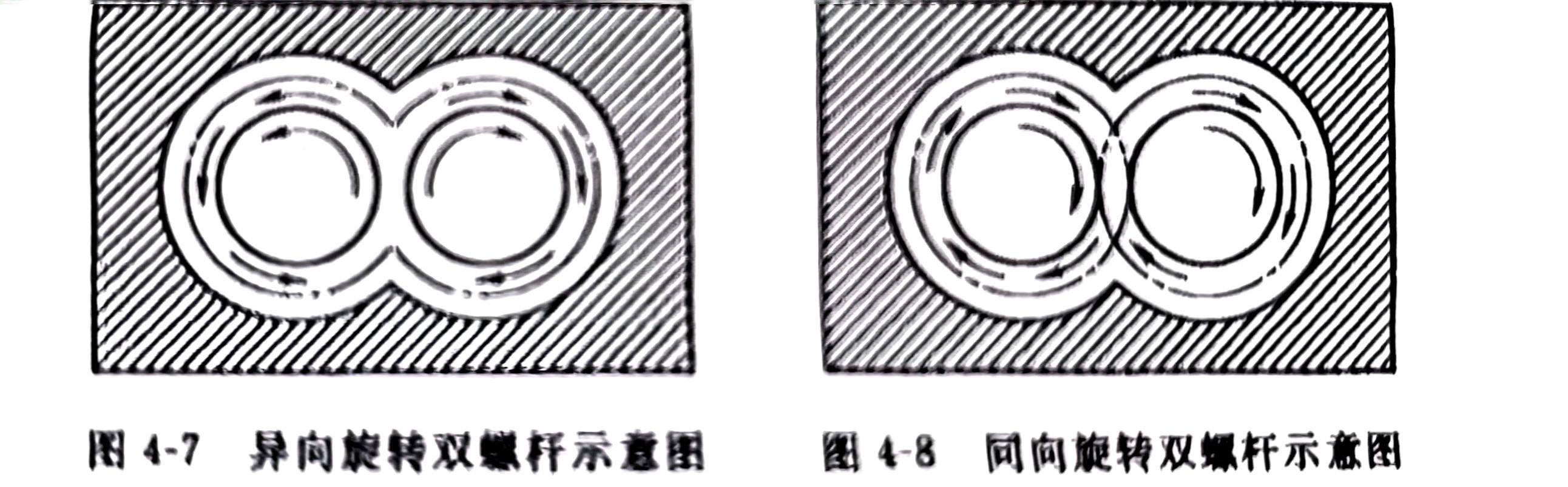 (1)混炼效果好 单螺杆挤出机混炼的效果不够理想,其原因是单螺杆挤出机的分散、混合作用仅依靠螺杆的压缩比及螺杆旋转时所产生的背压,以及由背压产生的反向流动所引起的。而双螺杆挤出机的两根互相啮合的螺杆在啮合处产生了强烈的剪切作用,对物料的分散与混合极有利。两螺杆的转向不同(异向旋转双螺杆和同向旋转双螺杆示意图分别见图 4-7 和图4-8),其效果也不同。对于异向旋转的双螺杆,物料在上下啮合处受到分流和剪切作用;对于同向旋转的双螺杆,一根螺杆的螺齿像楔子一样地伸入到另一螺杆的螺槽中,基本上阻止了物料由该螺槽进入到同一螺杆的相邻螺槽中去,大部分物料被强制地由一根螺杆的螺槽转移到另一根螺杆的螺槽中去。随螺杆的转动,物料在两螺杆之间反复转向,因而物料受到相当良好的混炼。据分析,在同向旋转双螺杆挤出机中,物料经过10个螺距后,混合次数可达22°之多。因此,即使参与共混的两聚合物的熔融黏度相差比较大,也能强制地混炼成为均匀的聚合物共混物。