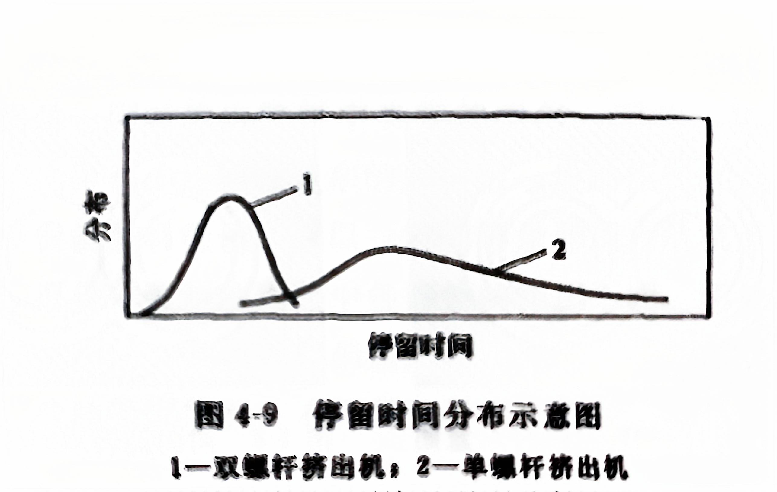 (2)物料在料筒内停留时间分布窄 物料在单螺杆挤出机中的流动有正流、逆流、漏流和横流等四种情况。逆流和漏流是由于机头、过滤板等存在的反压而引起的,它们将使得物料在挤出机料筒中停留时间分布变得较宽。而双螺杆挤出机的工作原理是"正向输送",所以物料在其中的平均停留时间比单螺杆挤出机少二分之一以上。同时,停留时间的分布范围也仅为单螺杆挤出机的五分之一左右,停留时间分布示意图如图 4-9 所示。因此,物料各部分在挤出机料筒内所经历的物理、化学变化过程大体相同,因而所得到的聚合物共混物的性能更均匀。双螺杆挤出机的两根螺杆互相啮合,旋转时彼此刮拭,从而可以避免物料对螺杆的黏附、缠包,这种效果称为螺杆的自清理作用;这种作用是使得物料在双螺杆挤出机中停留时间分布窄的另一原因。对于热敏性聚合物,停留时间的长短及停留时间分布的宽窄对共混操作十分重要。