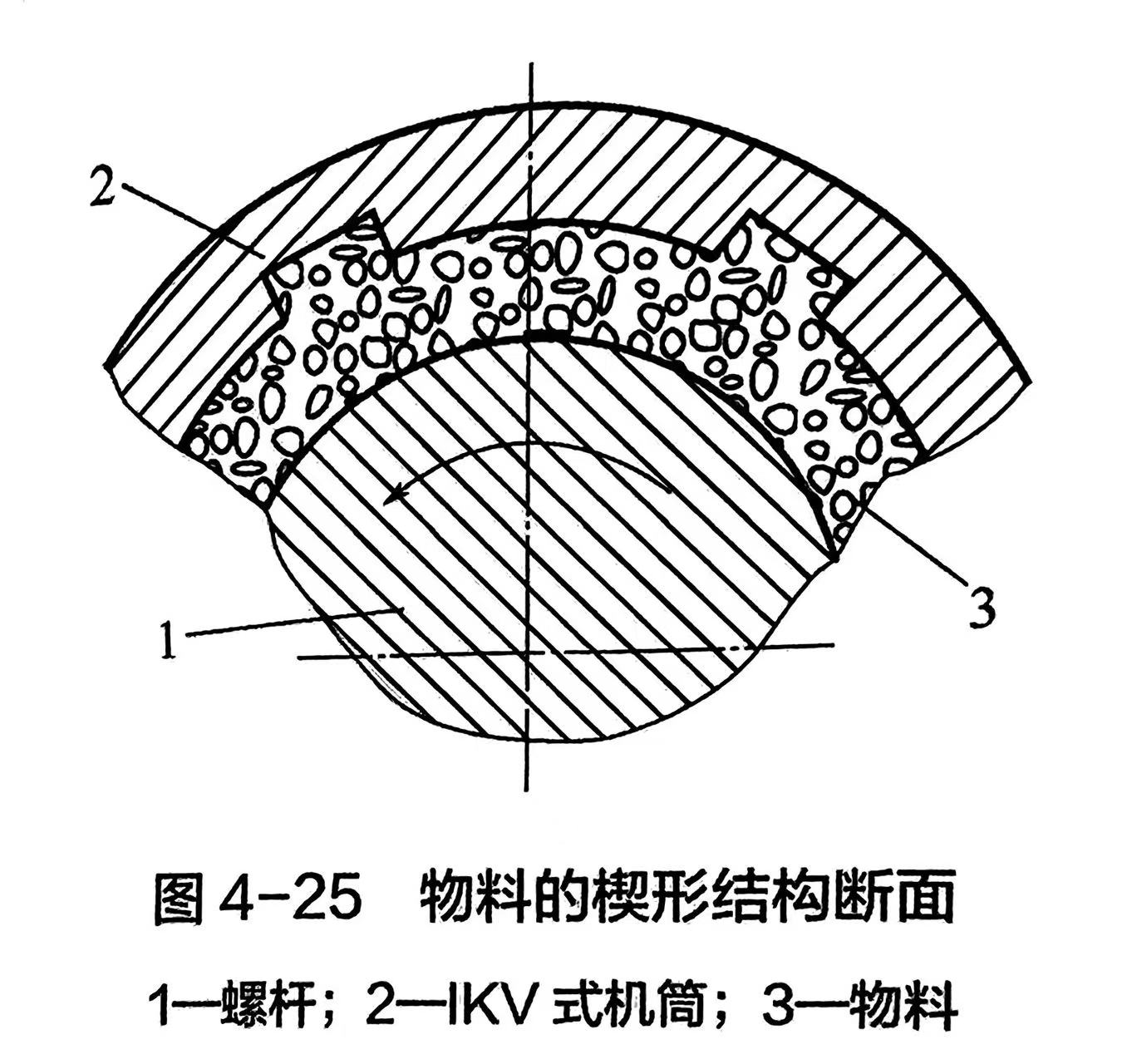 挤出工艺中,IKV式机筒通过增加机筒内表面的摩擦系数和加料口处物料通过面积,提高固体输送率。机筒加料段内壁设计成锥形,并开设轴向沟槽,沟槽深度由深变浅。物料在螺槽与机筒组成的环形间隙中,形状类似带翅的圆螺母套在螺杆上,翅卡在机筒凹槽中滑动,随螺杆转动沿轴向运动。