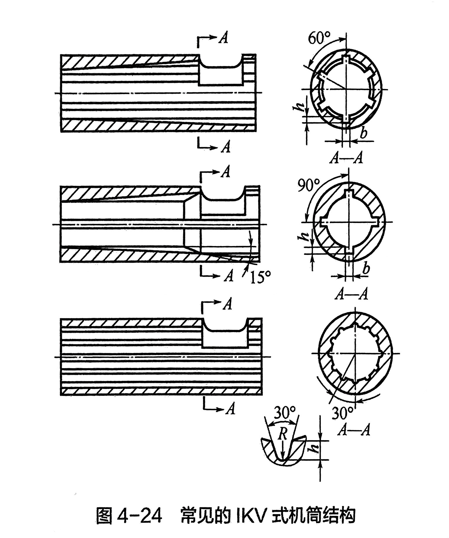 挤出工艺中IKV 式机筒 为了提高固体输送率,由固体输送理论可知,一种方法是增加机筒内表面的摩擦系数,还有一种方法就是增加加料口处的物料通过垂直于螺杆轴线的横截面积,将机筒加料段内壁做成锥形,并开设轴向沟槽,且沟槽深度由深变浅就是这两种方法的具体化,如图4-24所示。