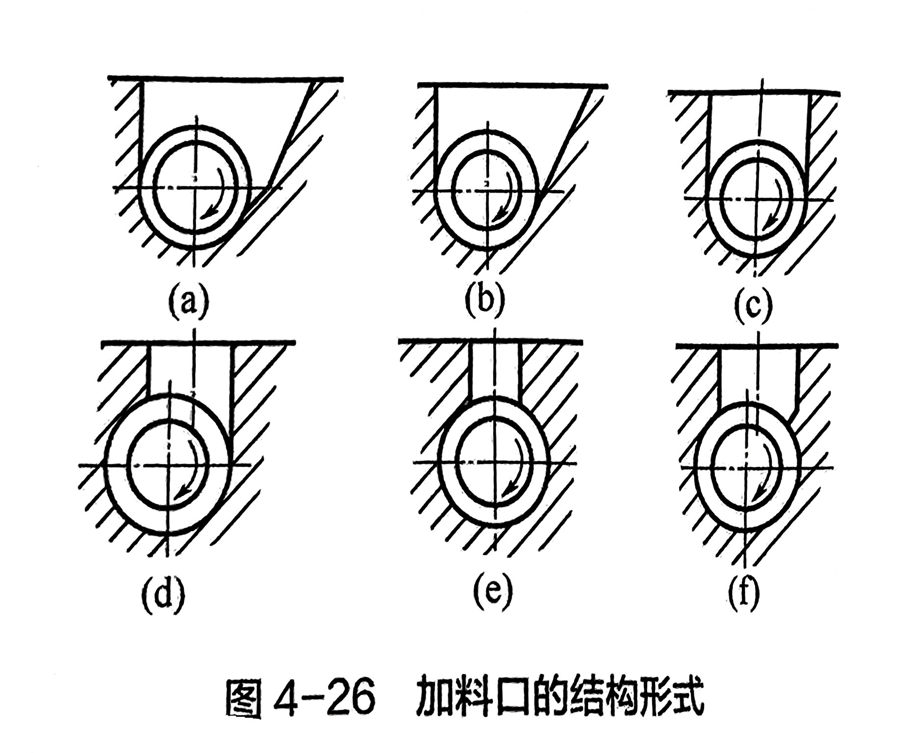 而其中(f)类的右壁下部倾斜45°。实践证明,(b)和(f) 两类加料口不论对粉状料、粒状料还是带状料都能
