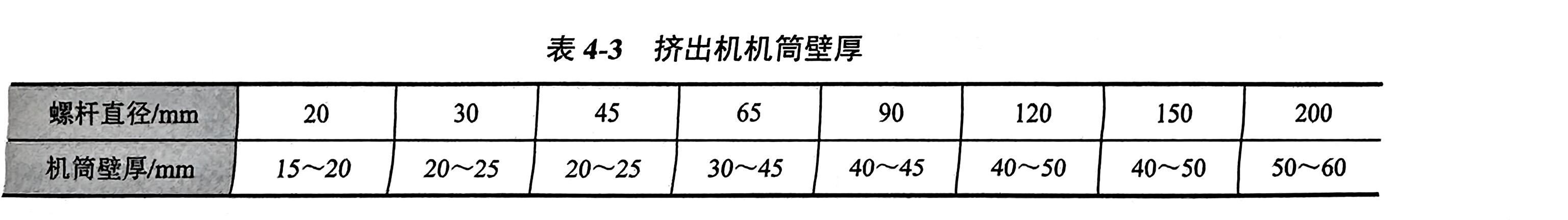 挤出工艺由于机筒外径与内径之比大于1,因此,机筒壁厚可用相关理论来进行计算。但实际上机简壁厚的确定并非主要考虑机筒的强度,而是两个方面的因素:一是机筒结构的工艺性;二是机简要有足够的热容量以减少机筒的温度波动。根据这两个因素确定的壁厚往往大于按理论计算的壁厚,由于按照机筒传热特性计算机筒壁厚的方法不成熟,因此,目前大多是根据经验来确定机筒的壁厚,挤出机机筒壁厚见表4-3。