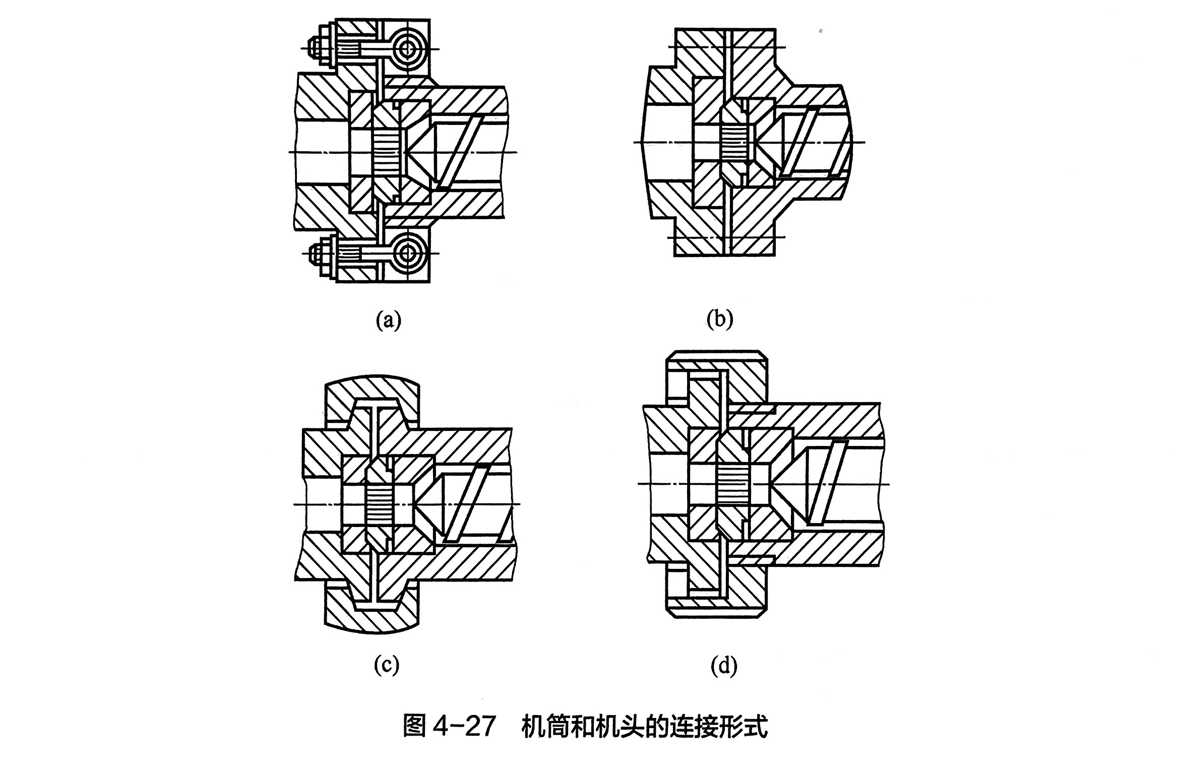 (c)为部分连接,拆装机头快,适用于小型挤出机:(d)为冕形螺母连接,拆装机头快。其中以形式(a)最为通用。